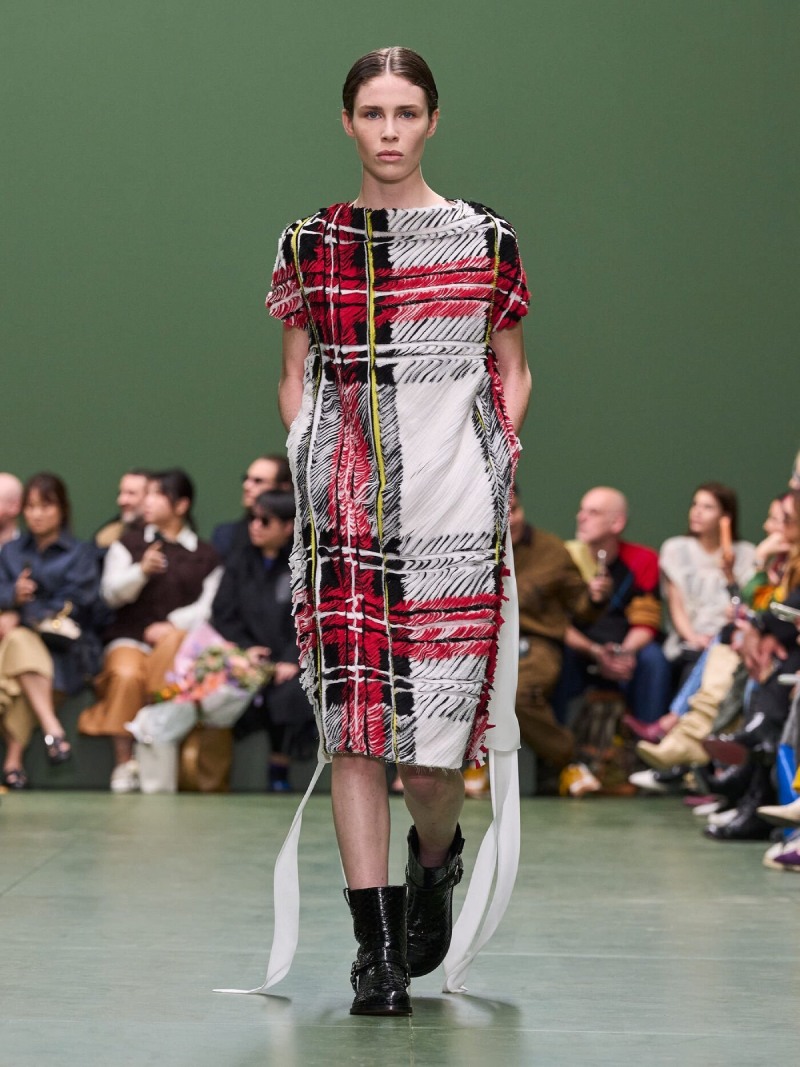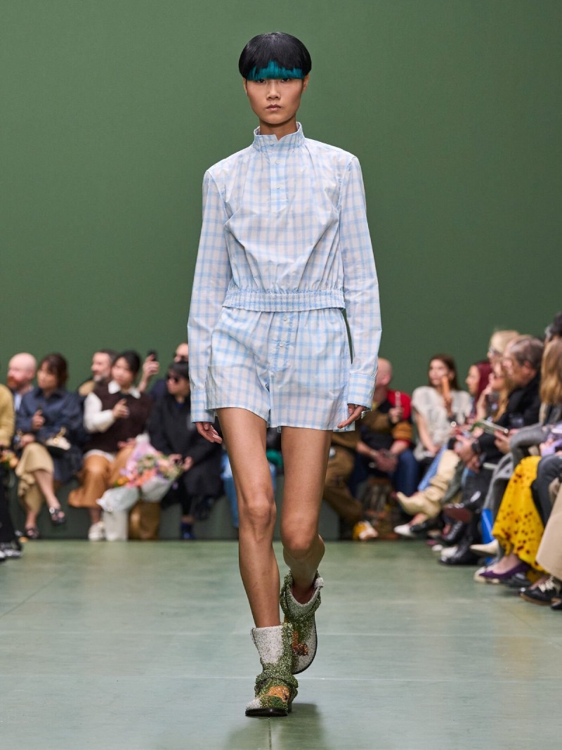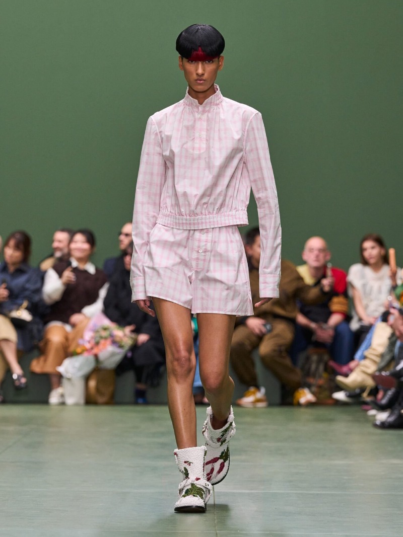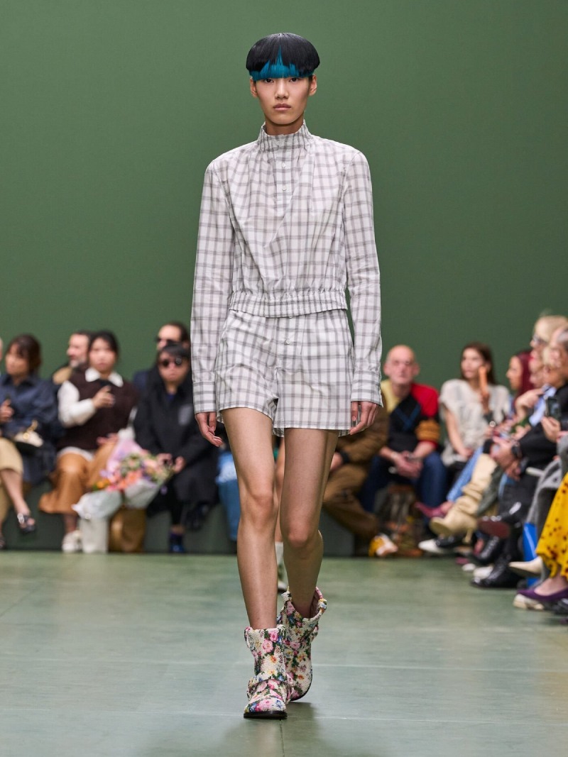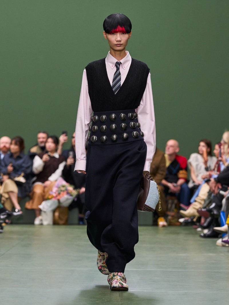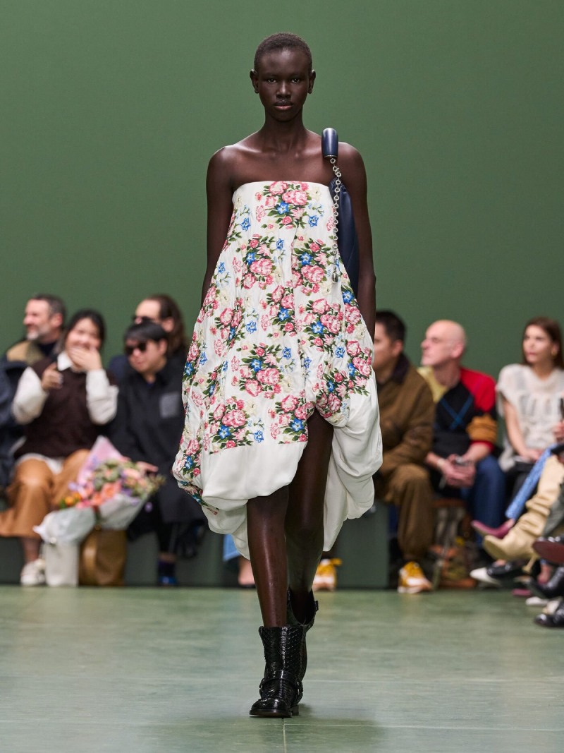 Seguidamente, Loewe Mujer FW24 introduce un vestido de construcción voluminosa decorado por el motif de un carlino, y versiones subsecuentes en colores lisos para apostar por el minimalismo clásico. Entre medias, vemos conjuntos de seda decorados con flores, tartán y trampantojo de avestruz, vestidos de cuero y más recursos florales clásicos. Los pantalones cargo de corte ultra baggy y las camisas oxford de corte oversize vuelven a convertirse en staples del armario femenino.