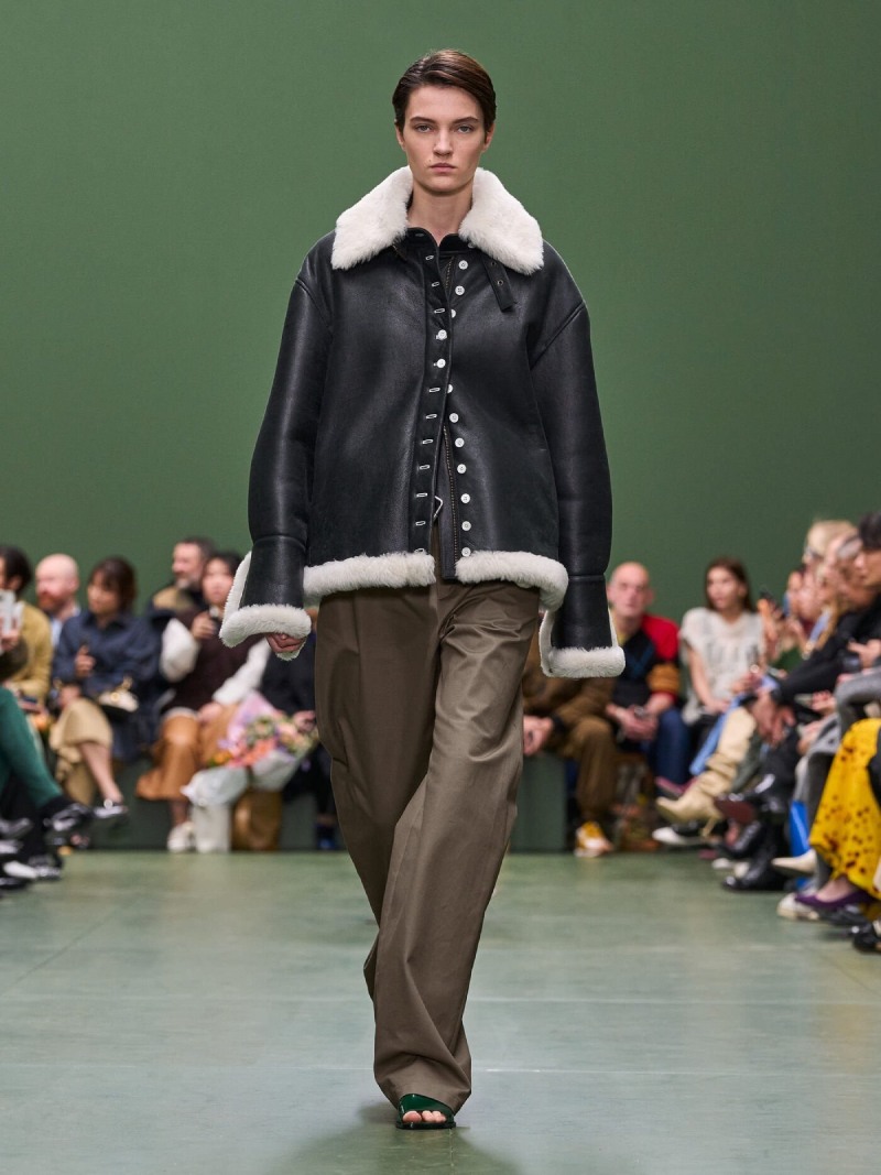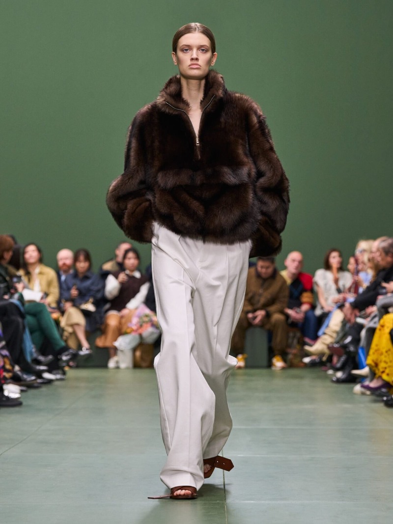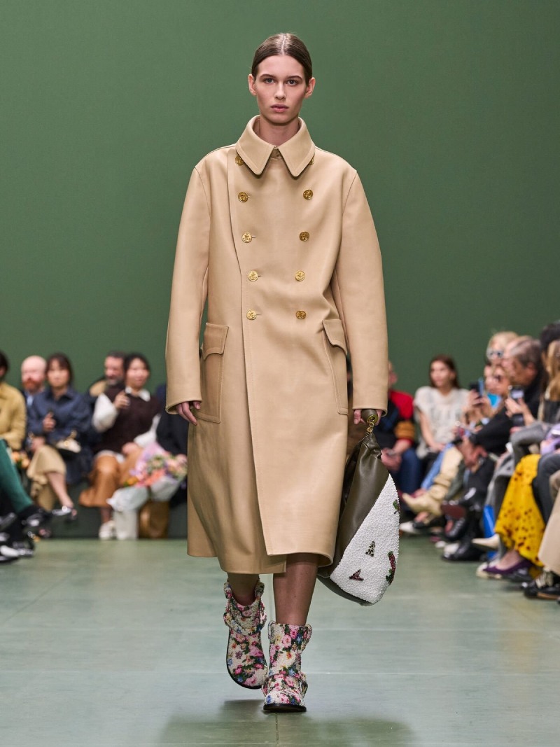 Como piezas de outerwear, Loewe Mujer FW24 presenta abrigos trench de cuero decorados con botones dorados y bombers de corte oversized, también en piel. En el lado más artesanal, blusones amplios de ante y cinturones de cuentas negras maxi. Y como pieza de indiscutible opulencia clásica, tenemos un cortavientos de corte urbano, construido con pelo marrón ultra lujoso.