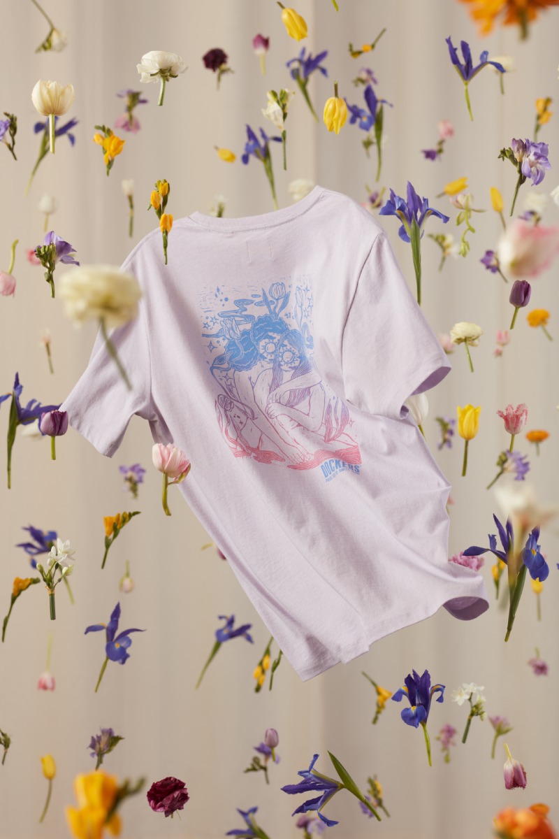 La nueva cápsula de Dockers Pride 2024 compone un armario genderless de 5 prendas decoradas con el arte de Crawley. El print de mayores dimensiones es una interpretación de la luz interior y exterior, con el iris para la fuerza y la esperanza. Los tulipanes que acompañan el diseño simbolizan el amor perfecto y profundo (en cualquiera de sus formas). El print más pequeño, por su lado, hace referencia al ciclo de inspiración de los artistas negros, con manos y flores que representan amor y cuidado.