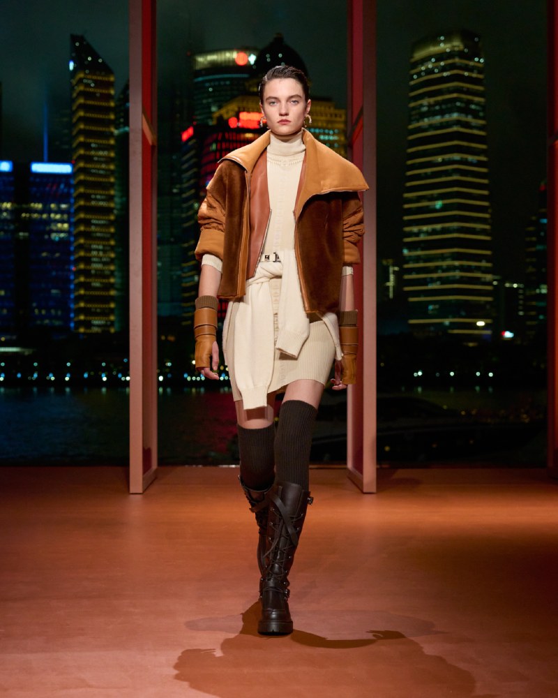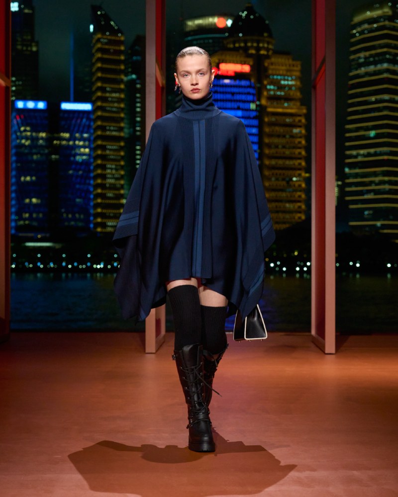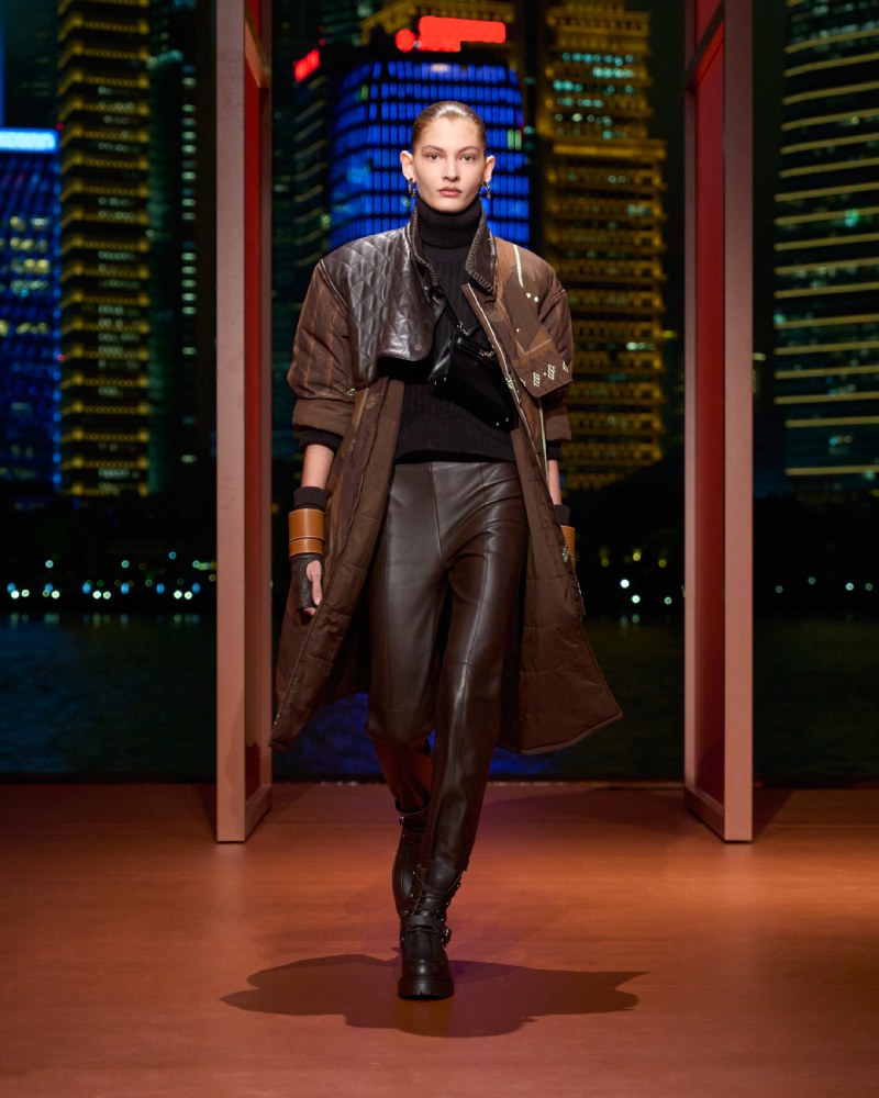 Ahora bien, ¿exactamente cómo son las prendas de Hermès Mujer Fw25? La colección abre con siluetas de outerwear en piel de espectáculo, de corte clásico modernizado y siluetas mucho más dinámicas. Debajo, encontramos staples de lo clásico como camisas de vestir y jerséis de cachemir. También, el theme ecuestre de la maison se reinterpreta en los abrigos con construcciones funcionales de quilting, botas de piel y medias súper altas. Las cazadoras de piloto también se convierten en un esencial de este layering complejo, y se presentan en versiones con cuellos súper statement. Otro de los pilares reinventados que componen el grueso de la colección es el jersey-poncho, reinventado en cashmere de doble faz y decorado con motivos geométricos.