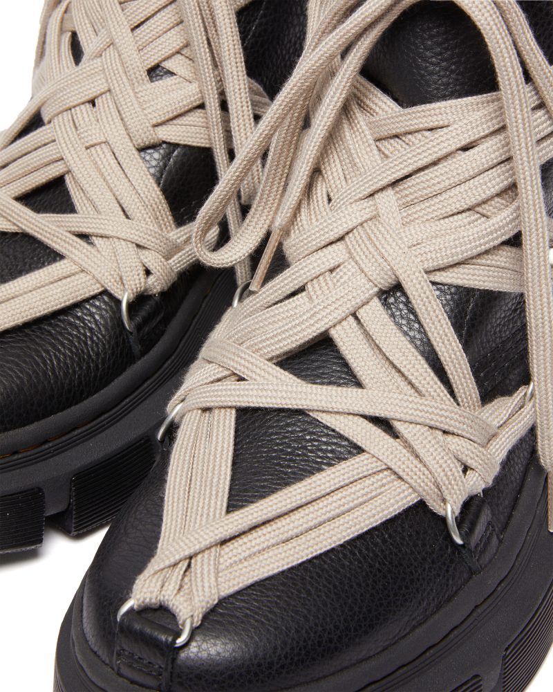 Como de costumbre, las botas de Dr. Martens X Rick Owens presentan el Megalace, un patrón de cordones envejecidos (presentes en muchas prendas de su mainline) en forma de pentagrama maximalista. Reforzando la identidad oscura, tenemos una lengüeta elevada, sobreproporcionada y mucho más arquitectónica que la de los modelos originales. Para mayor comodidad y facilidad de calzado, se agrega una cremallera en los laterales internos… ¿os imagináis tener que desamarrar todos esos cordones?