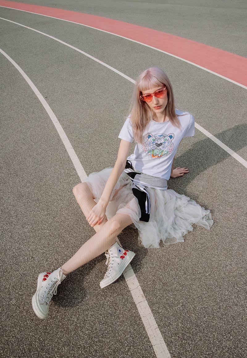 Camiseta KENZO + Falda CONCEPCIÓN MIRANDA + Sudadera a la cintura ADIDAS ORIGINALS + Medias CALZEDONIA + Zapatillas CONVERSE x COMME DES GARÇONS + Gafas vintage