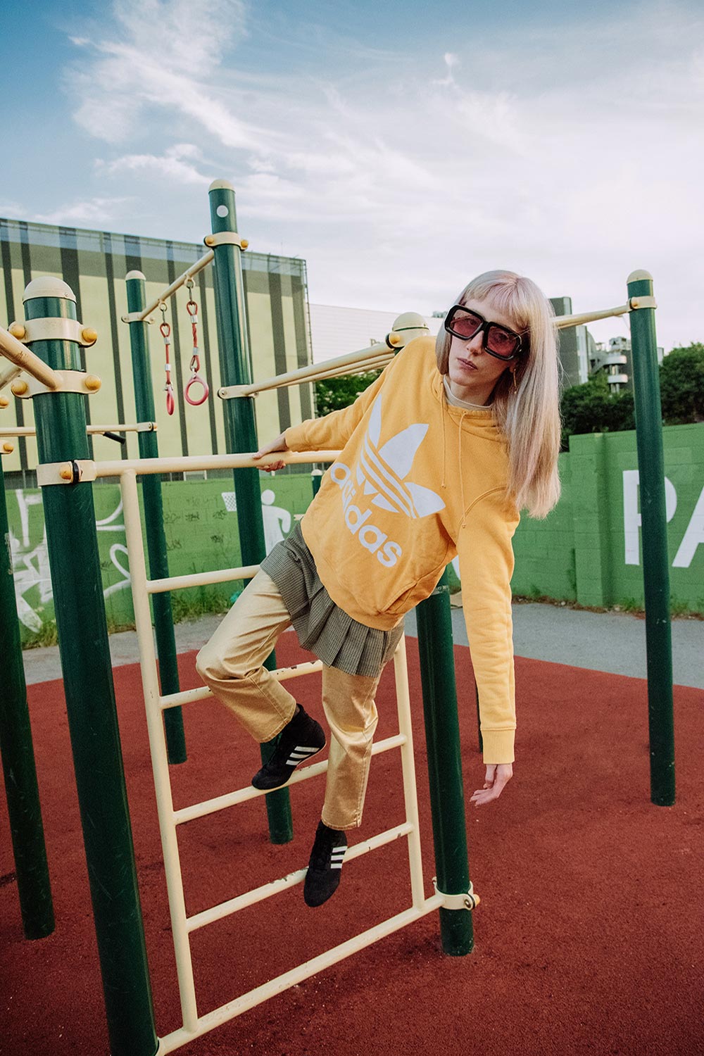 look athleisure: Sudadera ADIDAS ORIGINALS + Falda BLACK BOOK THE LABEL + Bolso LACOSTE + Zapatillas OSKLEN + Collares vintage