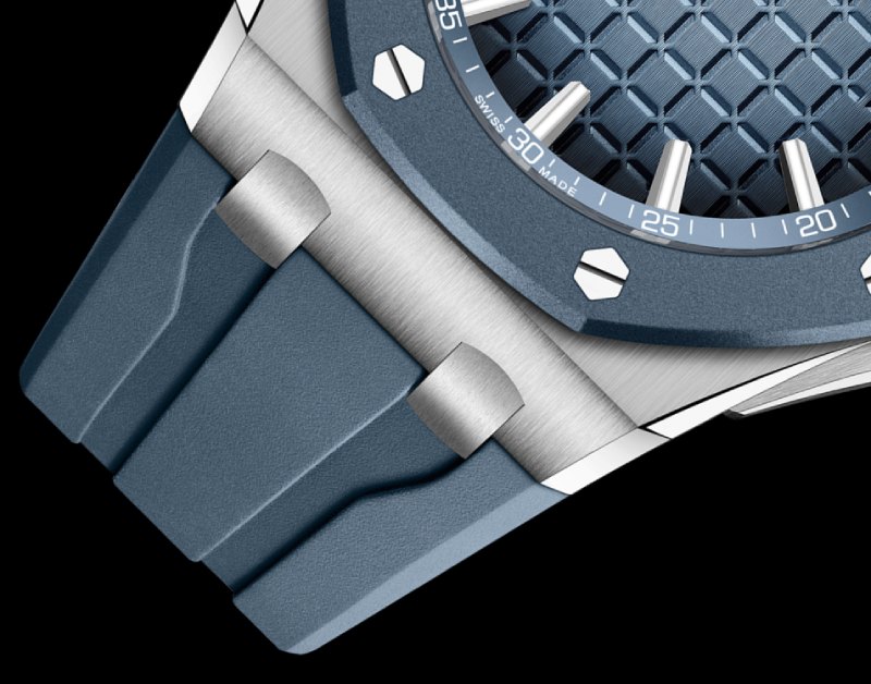 Las dimensiones se mantienen de gran formato, el nuevo Royal Oak Offshore presenta una caja de acero de 43mm tan robusta como siempre. Esta nueva versión incluye un bisel azul recubierto de goma (para protegerlo en nuestras aventuras). Dentro, nos encontramos el calibre self winding 4302 con función horaria, de fecha y reserva de 70 horas. La función de cronógrafo se deja de lado, mostrando una dimensión más clásica de la pieza. El nuevo Royal Oak Offshore se presenta con un dial Méga Tapisserie ahumado en azul, a juego con un bisel interno. Las agujas e indicadores clásicos del Royal Oak se construyen en oro blanco con tratamiento de luminiscencia y se deja ver una ventana de fecha en la tercera posición. Rematando el look, tenemos una correa de goma en el mismo tono (y también se incluye una de goma negra).