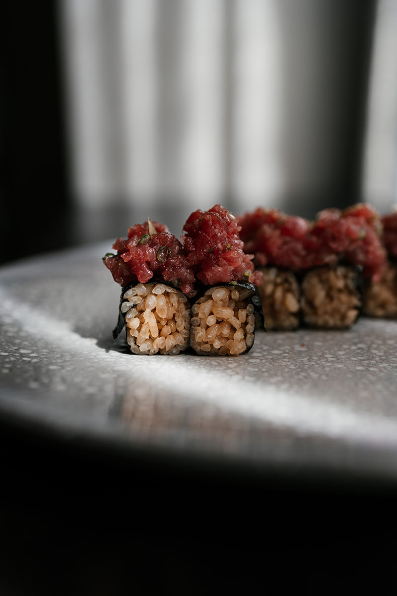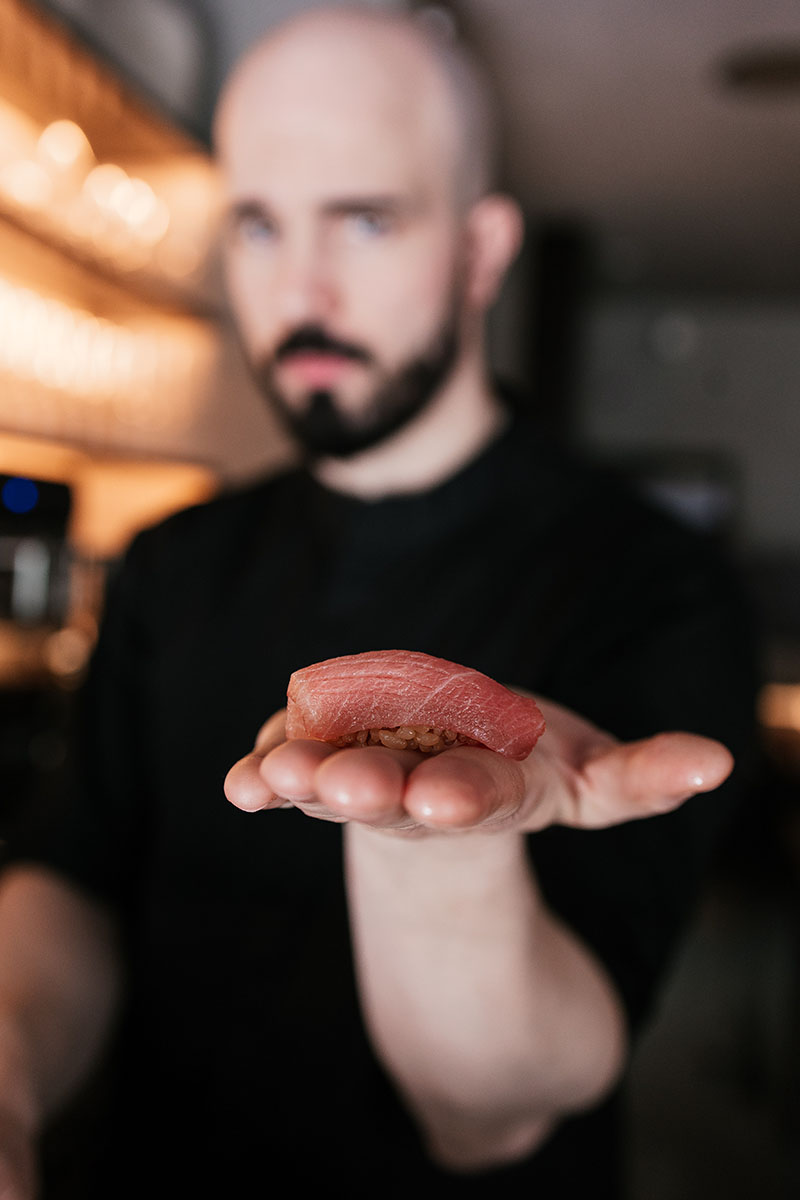 Nigiri Toro en primer plano y el chef Sergio Monterde desenfocado
