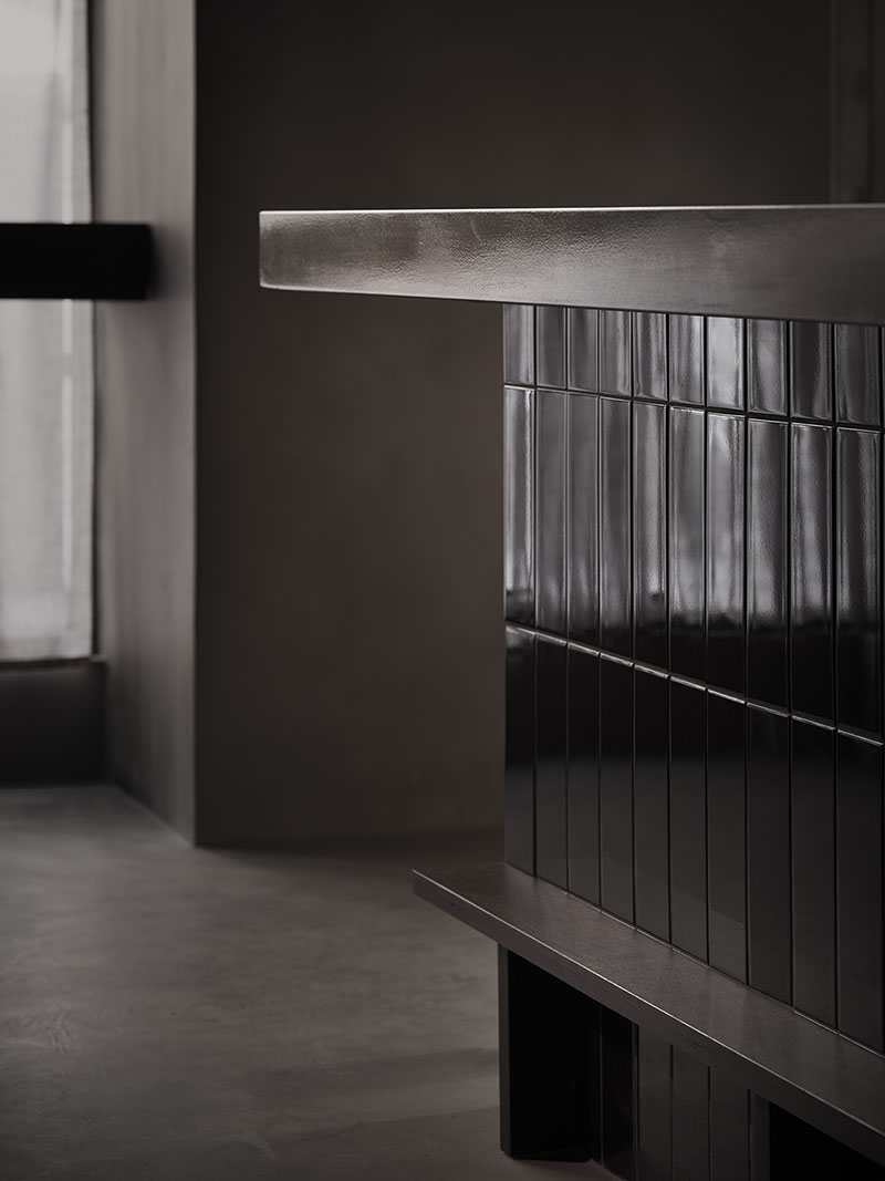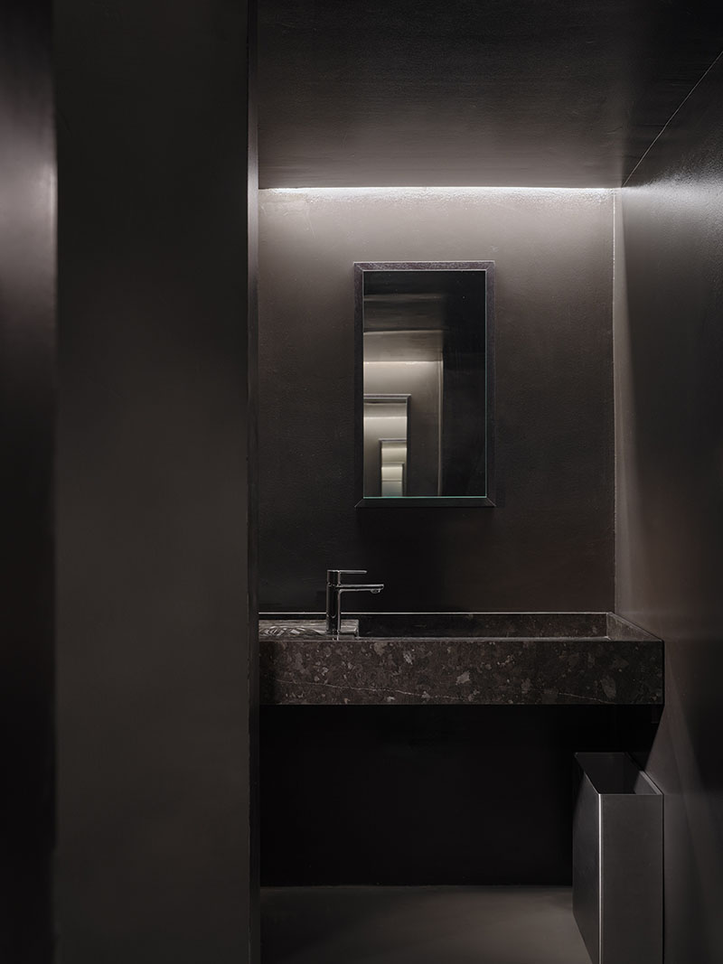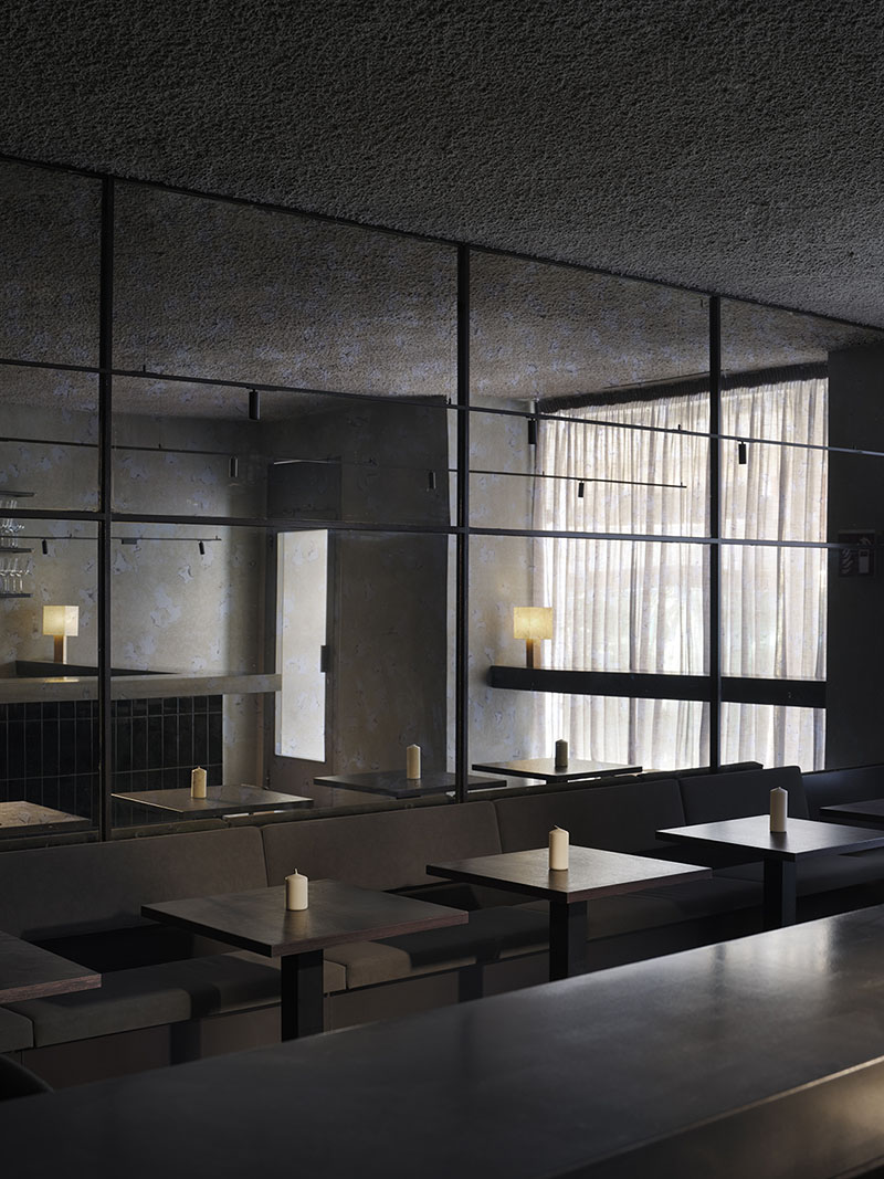 El material principal es el microcemento en paredes y techos. Hay varios tipos de maderas, teñidas en wengué, para tratar de conseguir ese juego de claroscuros que plantearon en el concepto del diseño. Granito y pintura marrón. Hierro y acero inoxidable. El tema acústico también está bien resuelto a pesar de los espejos que cubren una de las paredes y el gran ventanal que da a la calle. “Aplicamos sobre el techo un revestimiento proyectado de celulosa que funciona muy bien como absorbente acústico, y que introduce a su vez una textura más en el espacio que nos parece muy sugerente. Recomendación de nuestros amigos de Diir“, nos explican