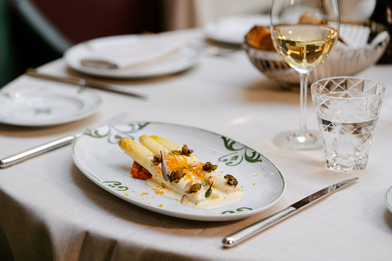 Espárragos blanco de navarra al sarmiento sobre romescu de verduras asadas y frutos secos, mahonesa de piparras y botarga rallada