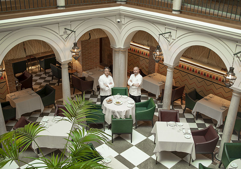 Imágenes superiores: 1) Patio con gran luz natural donde se ubica el restaurante. 2) Lomo de pargo a la malagueña con espuma de gazpachuelo de cangrejo de mar