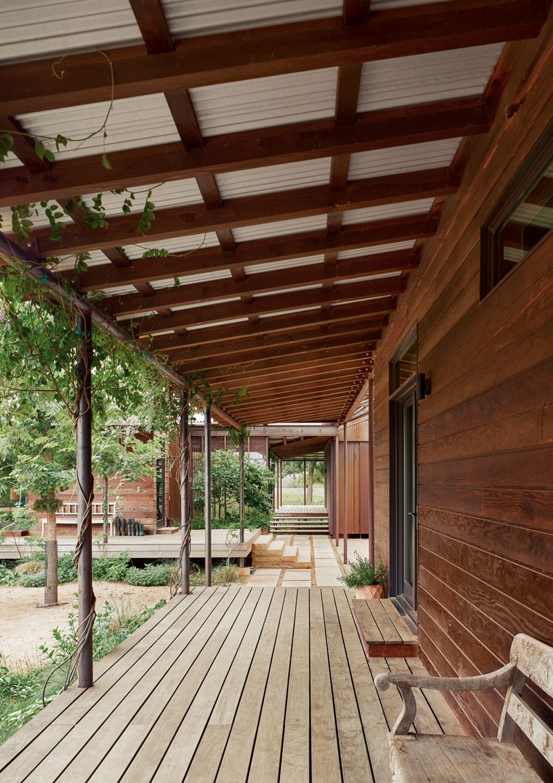La distribución de esta casa rancho tiene reminiscencias de la tradicional ‘dogtrot house’. Se trata de un tipo de casa rural, que fue particularmente común en el sureste de los Estados Unidos durante el siglo XIX y principios del XX. Una construcción simple de una única planta con un porche delantero y un corredor central que organizaba el interior de la vivienda.