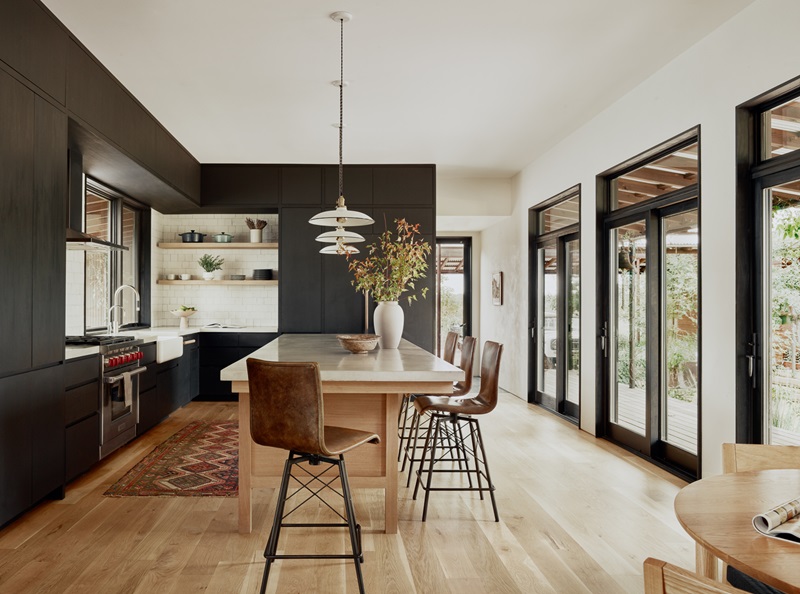 La madera es la gran protagonista de los acogedores interiores, utilizada tanto en los elementos de mobiliario como en las paredes y suelos. Casi siempre en color miel, aunque los arquitectos la combinan con tonos negros y blancos para aportar un toque de sofisticación. La luz entra a través de los generosos ventanales y puertas de cristal que presiden todas las estancias, elevando la calidez y la sensación de confort en el hogar. Una transformación sustancial, ejecutada de un modo tan sutil por Baldridge Architects, que parece que el rancho siempre hubiera lucido así en mitad de la naturaleza.