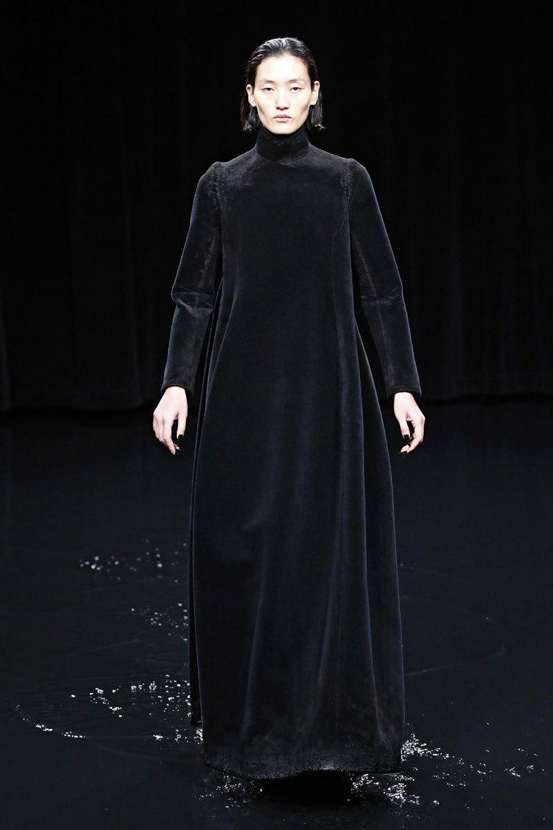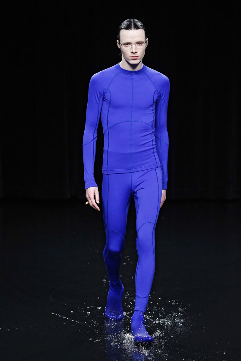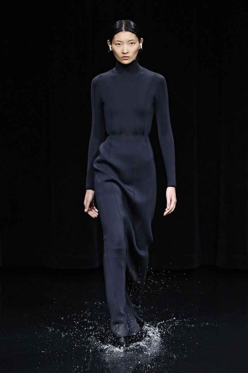 El techo del escenario también creaba ese efecto oscuro y apocalíptico con proyecciones a lo largo de todo el desfile que emulaban un cielo lleno de relámpagos, un océano bravo y el fuego del mismísimo infierno. La combinación de los modelos que chapoteaban recorriendo la pasarela con la música del desfile y las proyecciones hacían de todo el conjunto una verdadera fantasía satánica.