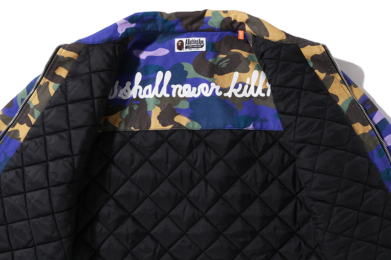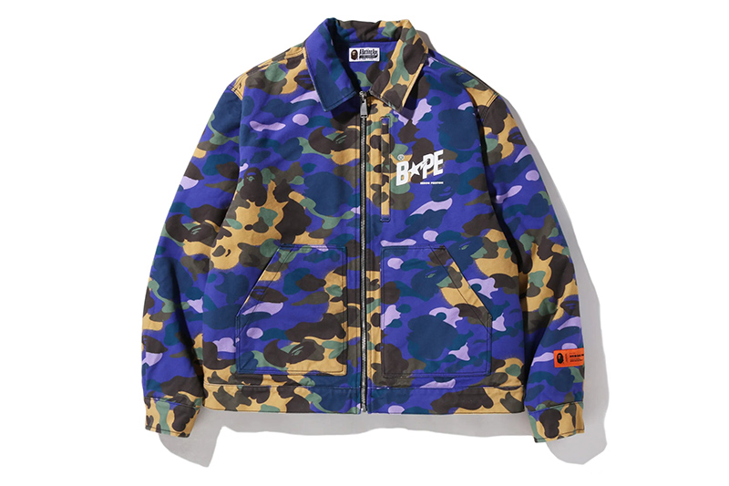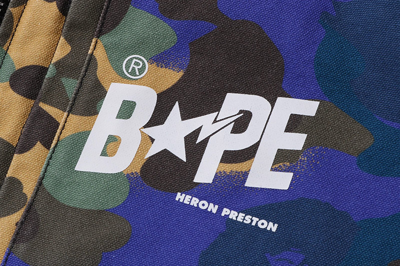 En primer lugar y como protagonista tenemos, obviamente, el camuflaje. Es uno de los elementos más arraigados a la identidad de la firma japonesa que esta vez ha sido reinterpretado por Preston en una mezcla de los colores originales junto a un nuevo camuflaje morado y único para la cápsula BAPE X Heron Preston.