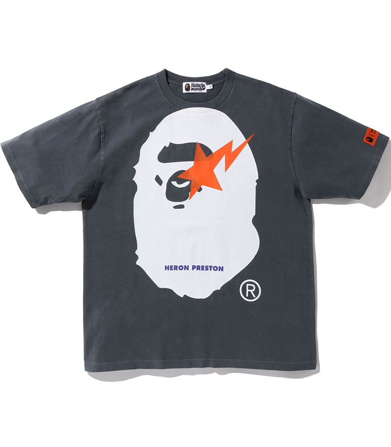 Las camisetas derivan directamente de las primeras prendas que produjo BAPE: con la cabeza de gorila en el centro en proporciones gigantes. Ahora tienen el branding de la colaboración y están ligeramente desteñidas… tal y como son las camisetas de Heron Preston.