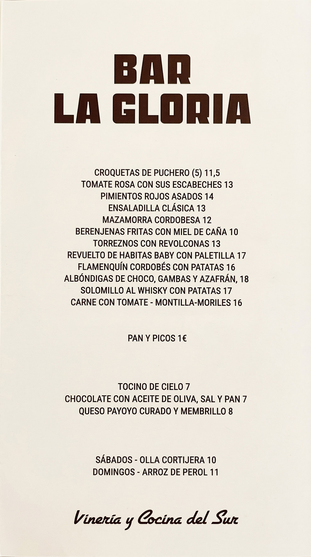 La Gloria toma su nombre de la abuela de Sol. En el establecimiento original el tributo salta a la vista; en Carabanchel hay que estar más al quite para detectarlo. Sin fotografías ni acumulación de objetos, queda condensado únicamente en un único elemento, más concretamente en un plato de la Expo 92, souvenir de aquel AVE entre Córdoba y Sevilla que ambas familiares compartieron.