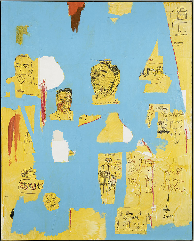 Mientras que el hip hop se conectaba con el linaje del bebop, el jazz también ocupaba un lugar clave en las pinturas de Basquiat. Se ubicó dentro de la herencia cultural afroamericana de Nueva York, vinculándose a un linaje artístico sin equivalente en el mundo de las bellas artes. Atormentado por el trágico destino de Charlie Parker, la figura de un genio devastado, Basquiat llenó sus obras de referencias a músicos y discos de jazz. Su comprensión del género cambió profundamente la composición de sus pinturas.
