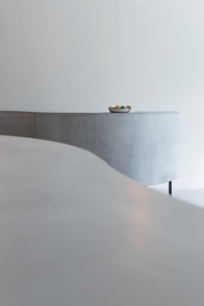 Una mesa de hormigón reforzado con fibra de vidrio que hace las veces de barra y que está pensada para socializar mientras se experimenta el placer de una gastronomía experimental basada en el molusco marino. Las ondulaciones de la pieza permiten a los clientes diferentes posiciones y de esta forma interactuar más o menos con el resto de comensales.