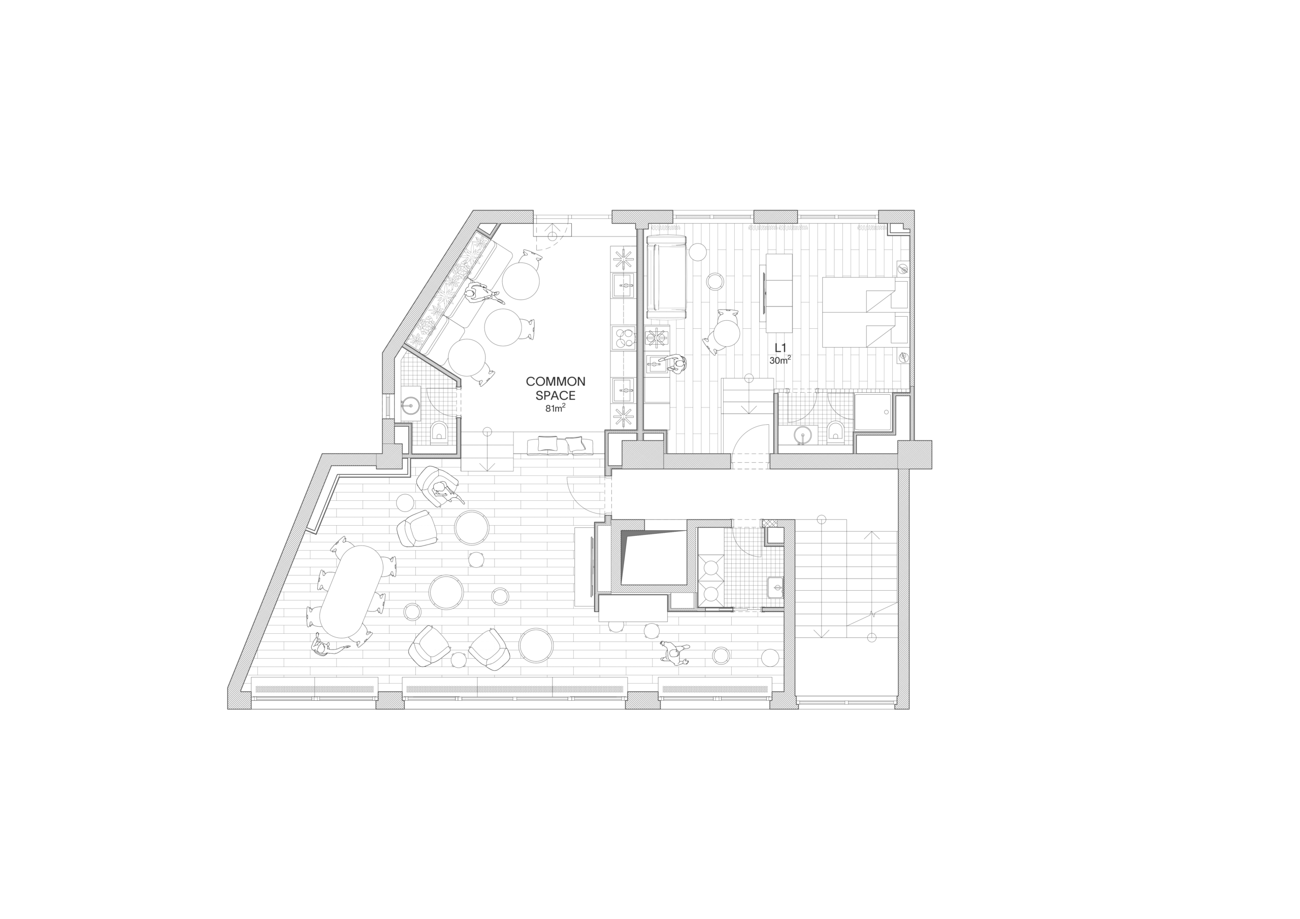 La planta baja está reservada para las zonas compartidas, con cocina comunitaria, espacio de descanso y lavandería. Según Beef Architekti, “coliving representa una alternativa asequible en las estructuras urbanas sin sacrificar calidad ni confort”. Además, remarcan que este modelo fomenta la convivencia, refuerza los lazos sociales y permite compartir recursos en un entorno donde el acceso a la vivienda resulta cada vez más difícil.