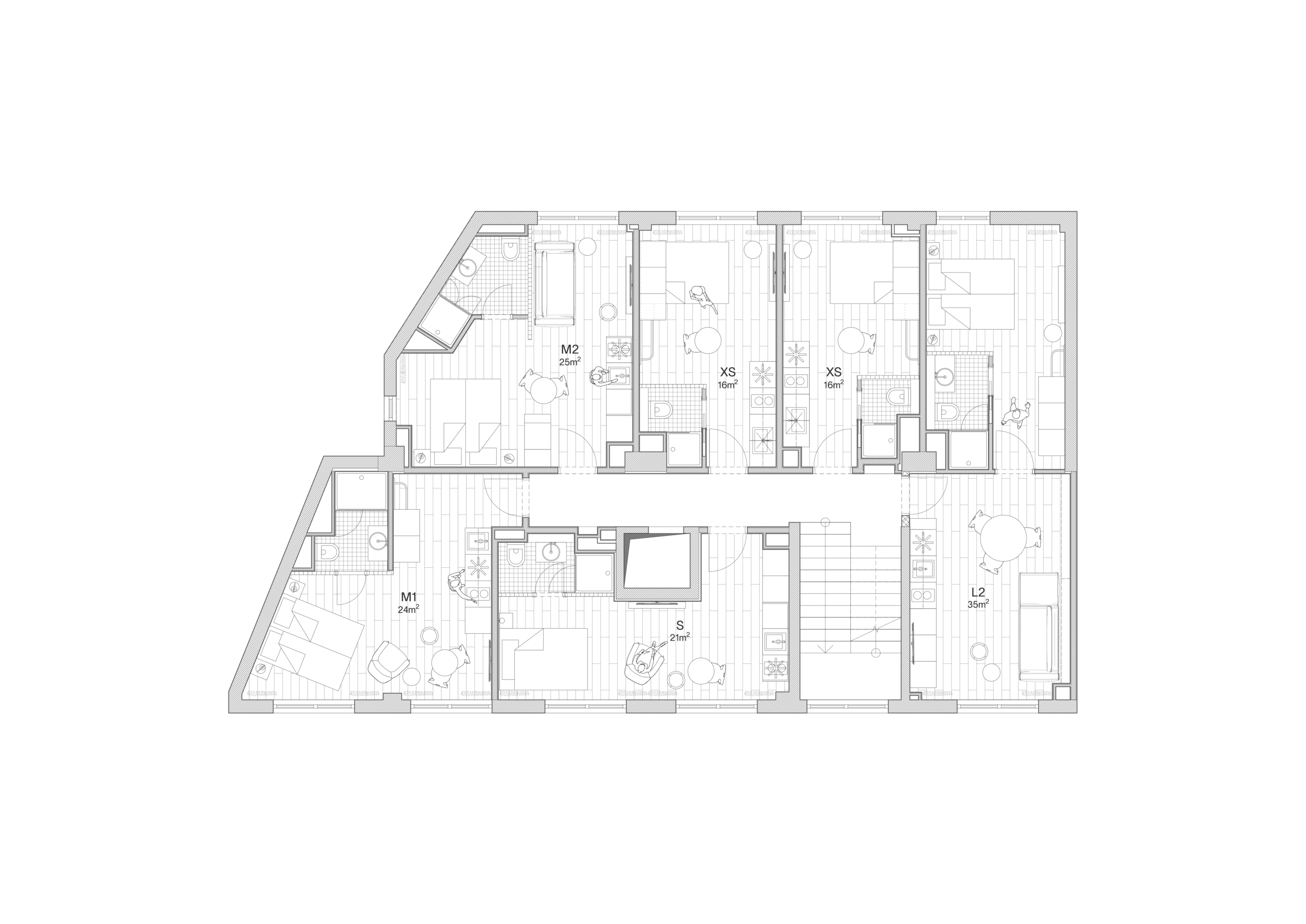 Unidades residenciales: 19 apartamentos (de 16 a 35 m²).