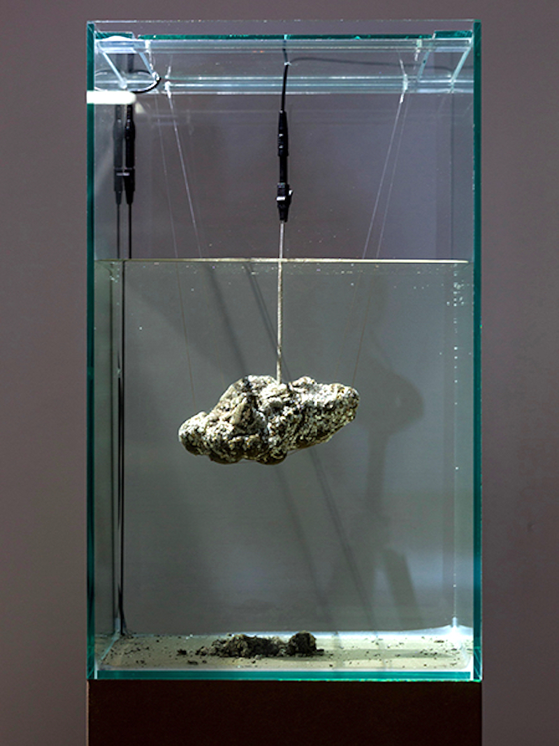 Cuatro figuras de tamaño natural colgadas de unas cuerdas conforman la pieza The Retrospective View of the Pathway de Roger Hiorns. Dos de ellas son más o menos realistas, mientras otras dos son más abstractas, como desmontadas, reducidas si se quiere. Cuelgan al revés y de vez en cuando se sueltan las cuerdas de modo que los cuerpos caen al suelo, luego vuelven a su lugar de origen en espera de la próxima inevitable caída. En la pieza de Cecile Beau y Emma Loriaut, Reversion, una piedra parece levitar en un líquido. Dos barras de metal conectadas a un sistema de electrólisis transmiten una corriente eléctrica a este baño químico. Con la electrolisis se generan cristales de plata que crecen como plantas y cubren lentamente la superficie de la roca. La reversión es un proceso alquímico desconocido, que aquí revierte el proceso de transformación del mineral en materia industrial.