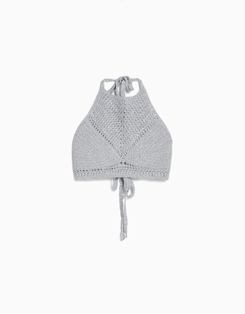 Lo sentimos si no te gusta nada el tejido crochet, pero es un básico estrella este verano. De toda la amplia selección que tiene Bershka, sin ninguna duda, nuestro favorito es este top corto con cierre de cuello halter. Además, tiene un cierre de espalda que es fantástico porque sujeta bien el pecho. Esto último es muy importante, cuando vayas a comprar una prenda de este estilo.