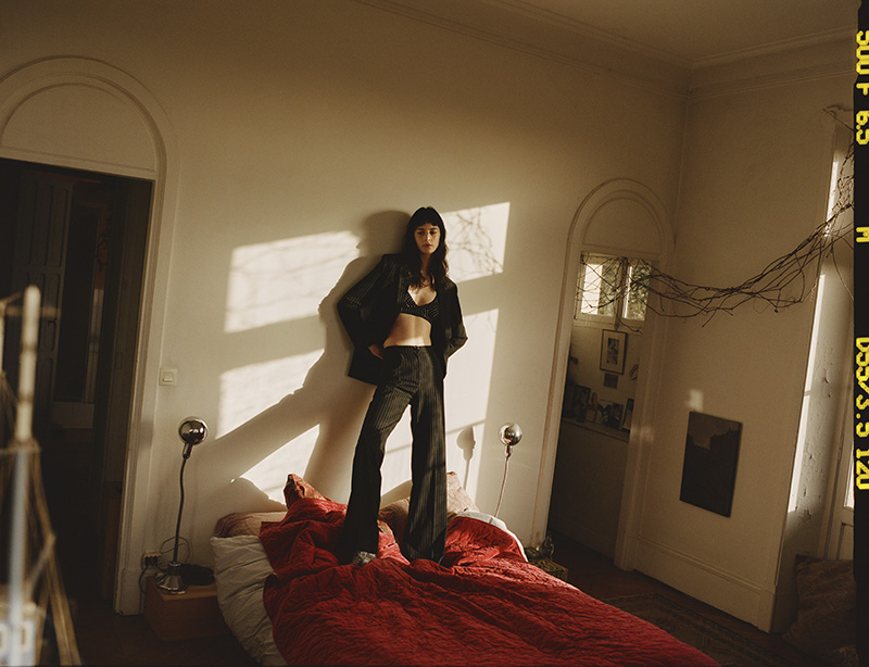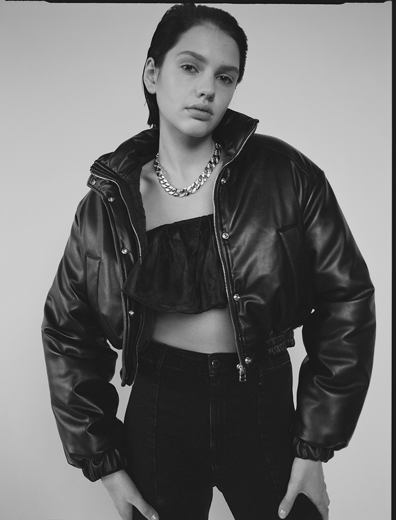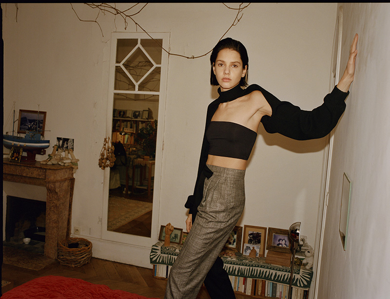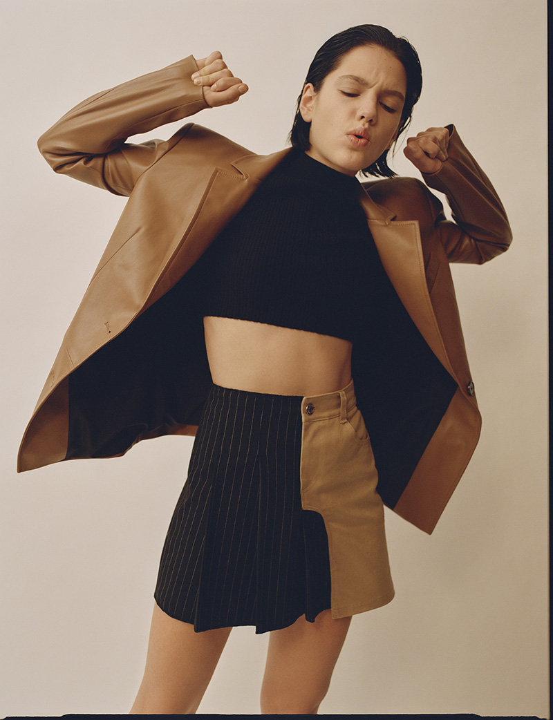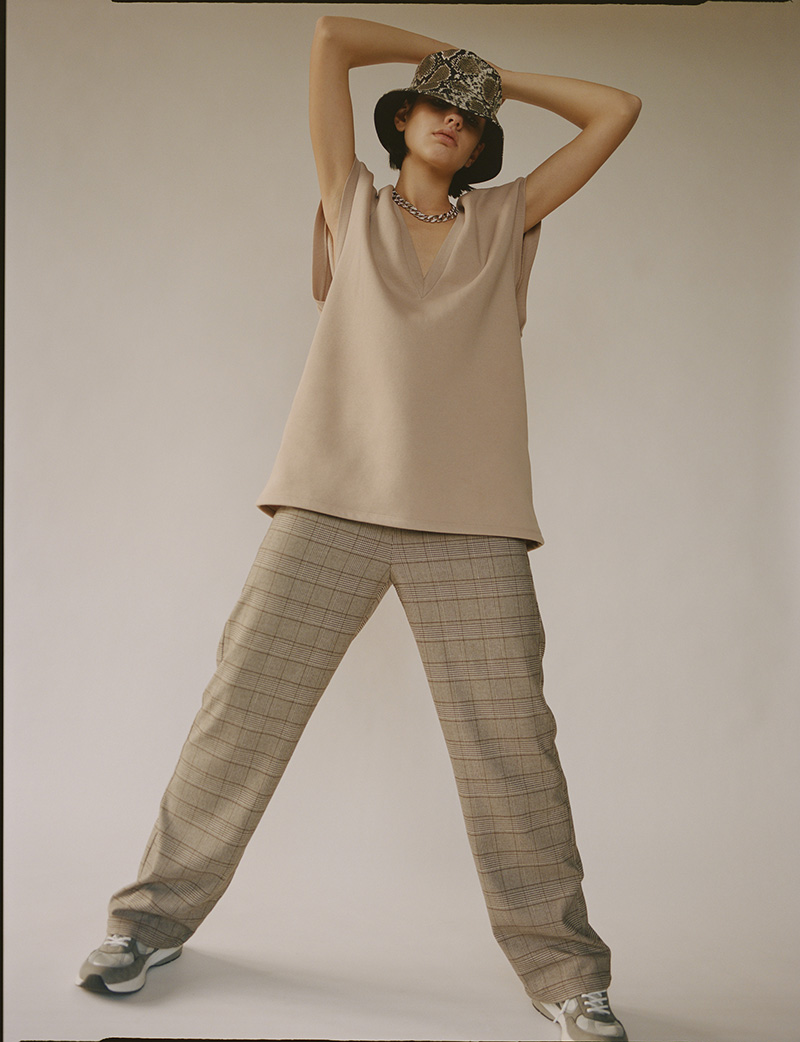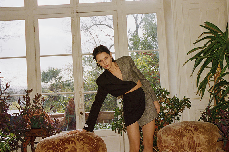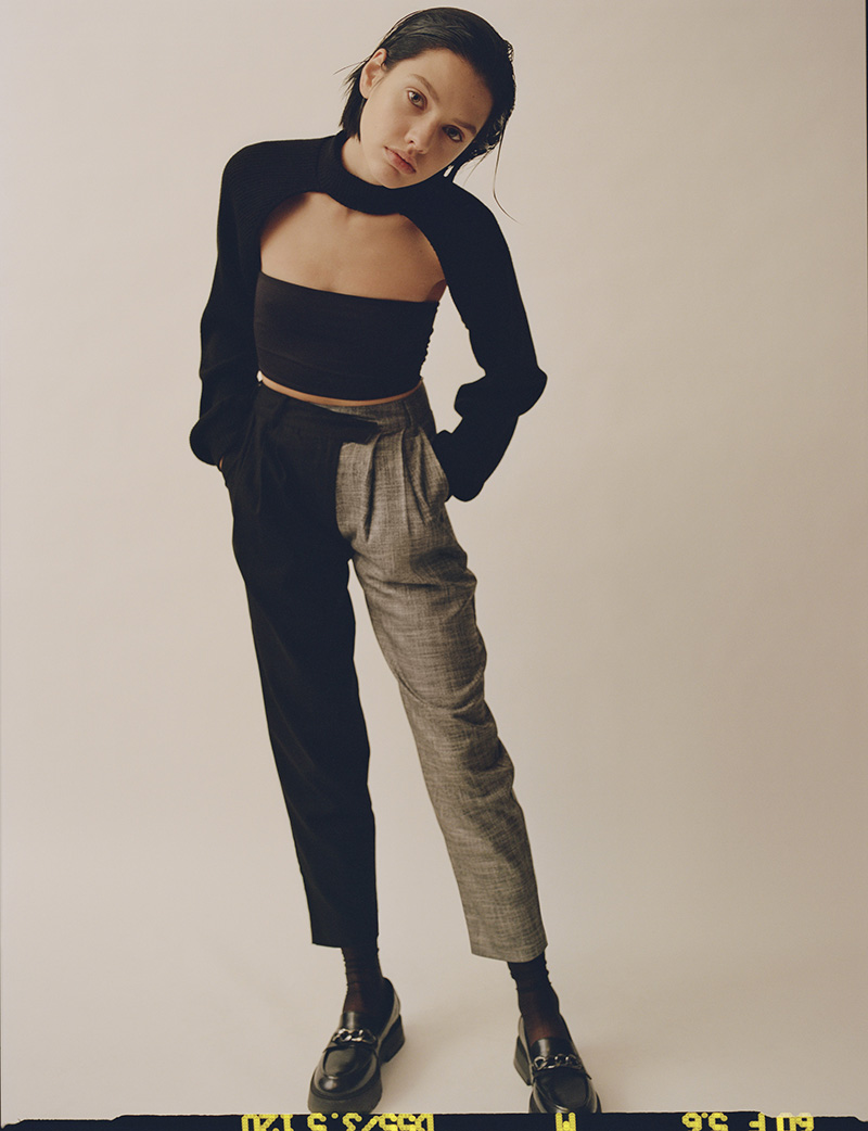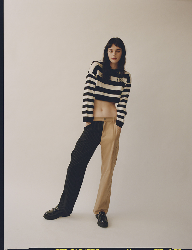 Bershka 2Tailored juega con los códigos sartoriales, las proporciones y el mix and match proponiéndonos una americana oversize con hombros cuadrados en la que se combinan el negro y la raya diplomática, y otra cropped con minifalda a juego, en las que conviven el negro y el gris. La mezcla de colores se da también en unos pantalones de tiro alto, que se combinan con un crop top y unos calientabrazos a juego, uno de los must de la temporada.