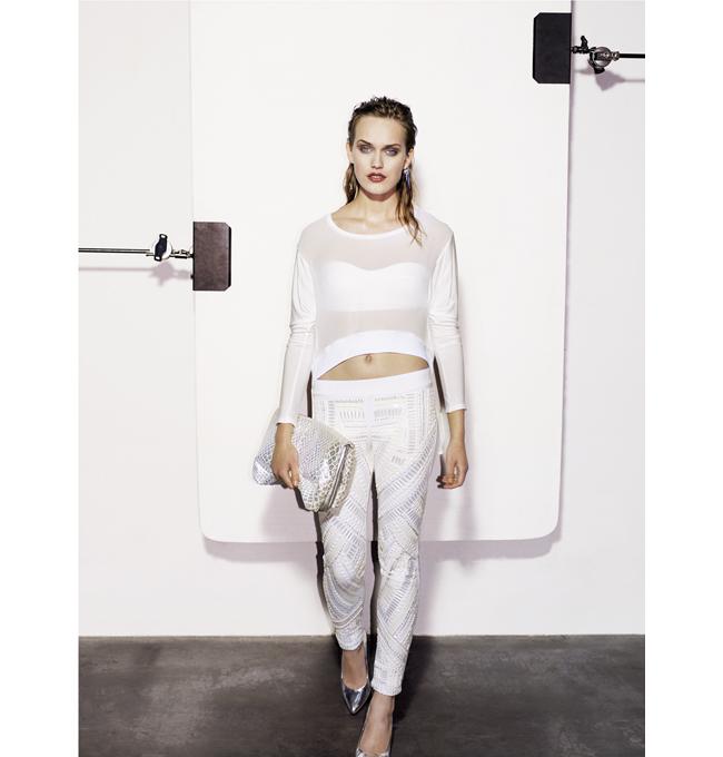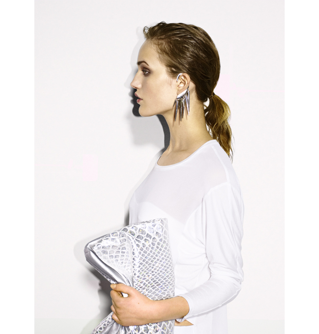 Bershka SS/13: La apuesta de la temporada es la sofisticación asequible materializada en cortes rectos y simétricos, de inspiración folk, con acabados metalizados y mucho sport-deluxe. Capas, troqueles, transparencias, denim con efecto bleach, volantes, plisados en degradé y relieves textiles. Tonalidades flúor suavizadas, colores orgánicos, estampados geométricos y bordados étnicos e incrustaciones ikat. Metacrilatos y vinilos protagonizan con iridiscencia el mundo del complemento. Remix de materiales en bolsos y calzado voluminoso: vinilo con piel y/o serraje.