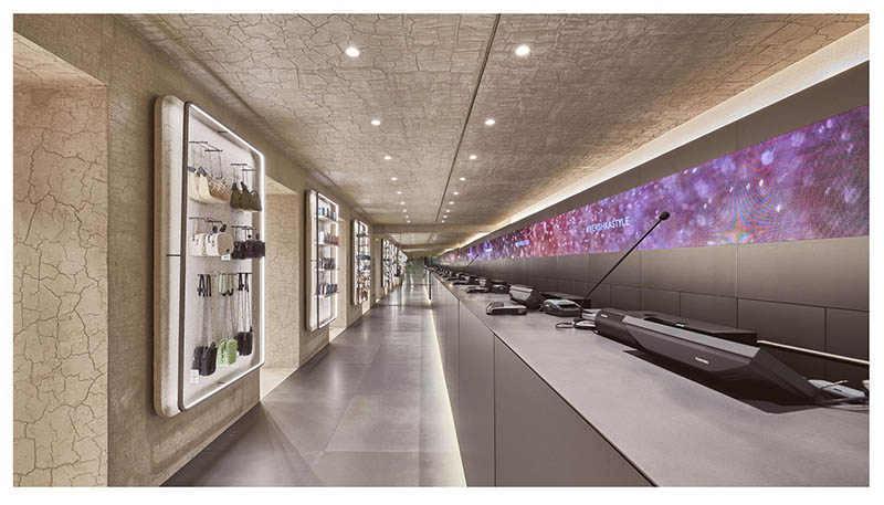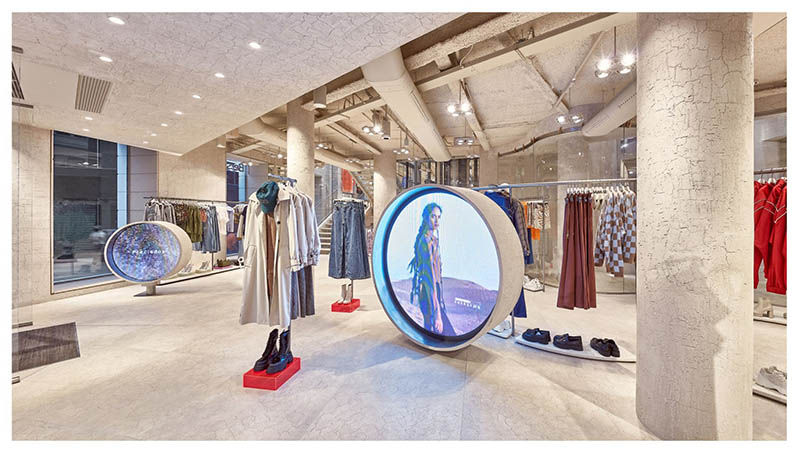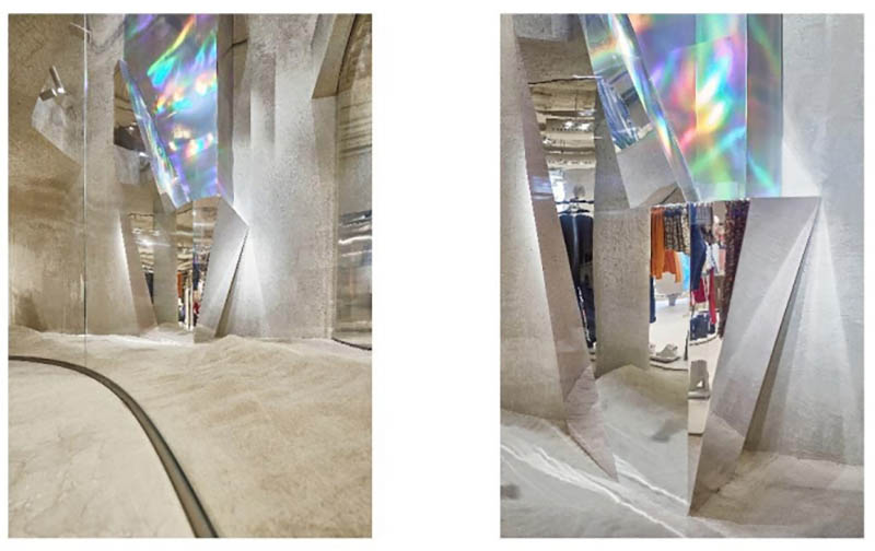 Sobre los muebles elegidos destaca la mezcla de materiales cálidos y fríos. Tubos metálicos para colgar prendas y estructuras de piedra con una estética muy industrial para sostener las colecciones. Sin duda alguna, el hilo conductor de Bershka Preciados es la naturaleza, que decora muchos de los rincones. Sin embargo, lo más especial de la decoración es la participación del artista JDEMSKY en dos obras artísticas que se integran en el interior de la tienda. Phase SN-X es una escultura metálica con inspiración primitiva y de origen desconocido con una apariencia robusta y un efecto óptico e iridiscente creado por el reflejo lumínico en sus espejos. La segunda obra son los Probadores HYPRSPC, un hiperespacio o espacio multidimensional que juega con la perspectiva y el dinamismo.