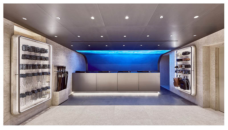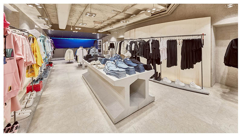 La nueva tienda explora texturas que se alejan de los establecimientos tradicionales para producir una sensación de calidez y modernidad con material térreo y elementos industriales que organizan las prendas. Destaca también el uso del acero en un juego cercano a la papiroflexia. Sin duda alguna, Berskha Preciados cede el protagonismo a la ropa pese a ser un espacio elegante y actual. La zona de caja se encuentra en en un córner metálico presidido por el acero y los espejos que dan sensación de infinitud sobre un suelo industrial. En cuanto a los probadores, se encuentran conectados con la planta baja y están diseñados y construidos en forma de hélice. En armonía con estas partes también encontramos también el rincón Click&Collect para recoger pedidos online entre sofisticadas luces y acero galvanizado.