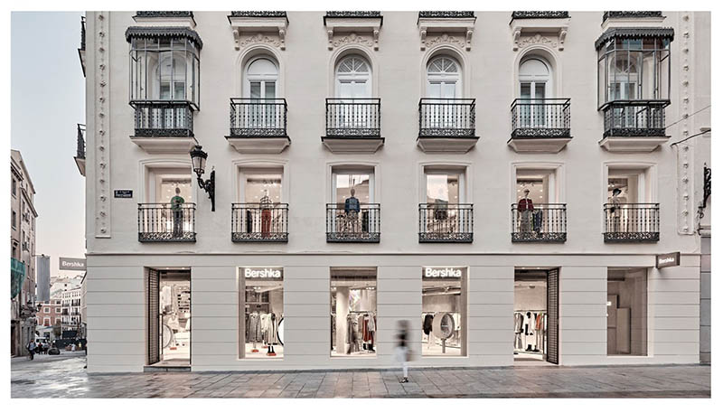 Bershka Preciados es una tienda única. Situada en un edificio original del siglo XIX encallado en el número 5 de la calle Maestro Victoria. La reforma ha unido dos edificios de distinto nivel para generar un edificio con un resultado espectacular basado en el impacto visual. Es un espacio vertical comunicado por cristaleras y una escalera de peldaños volados. La verticalidad se lleva al máximo nivel hasta llegar a la quinta planta que alberga un objeto escultural. La nueva tienda de Berskha Preciados supone un contraste de materiales y volúmenes con la combinación de la geometría rectilínea y las curvas del cristal.