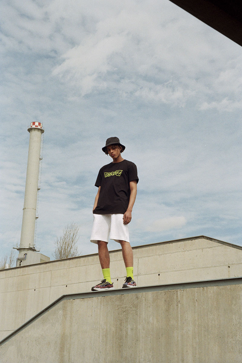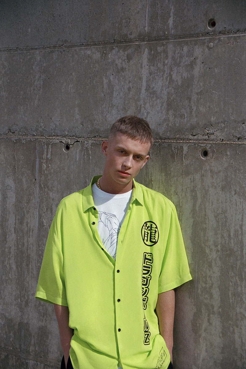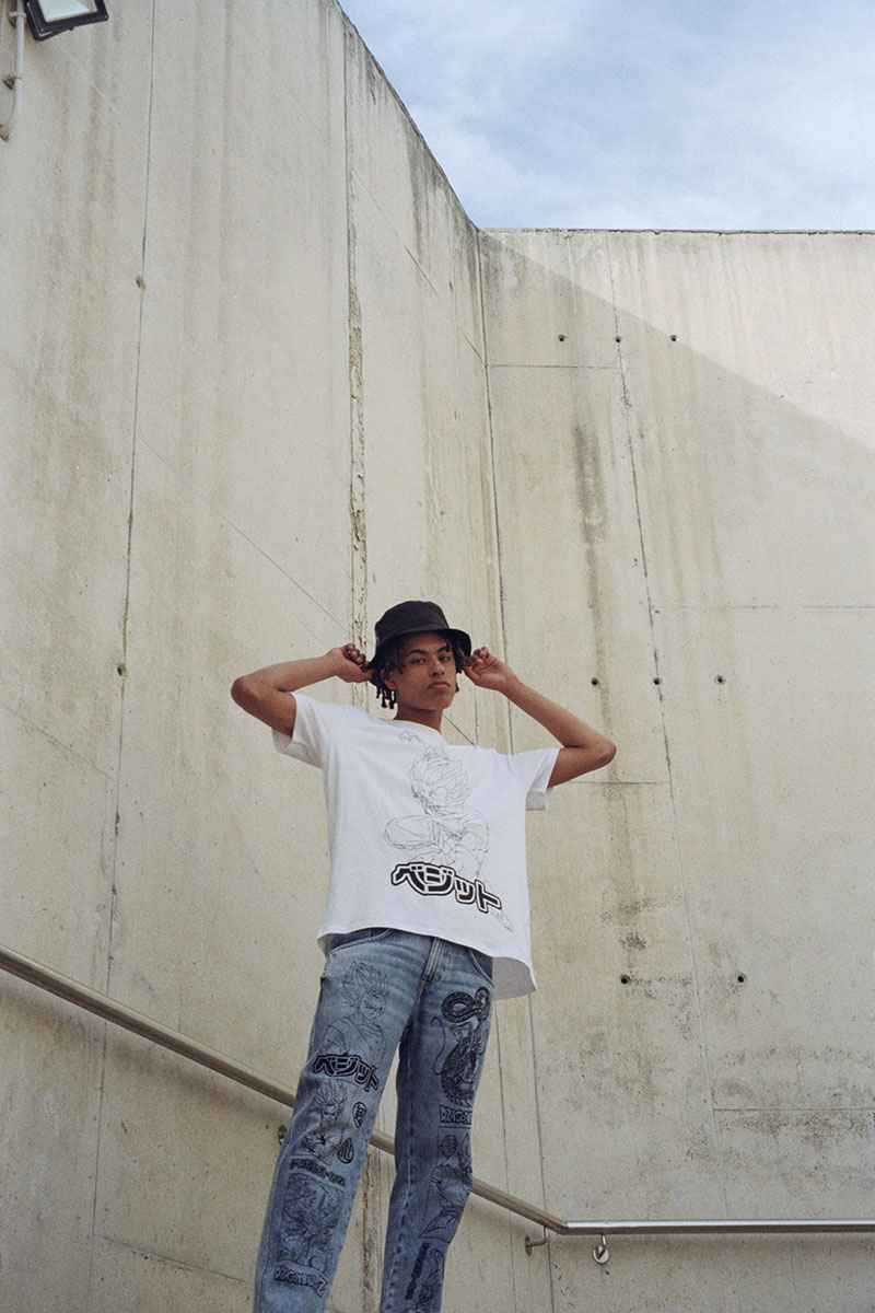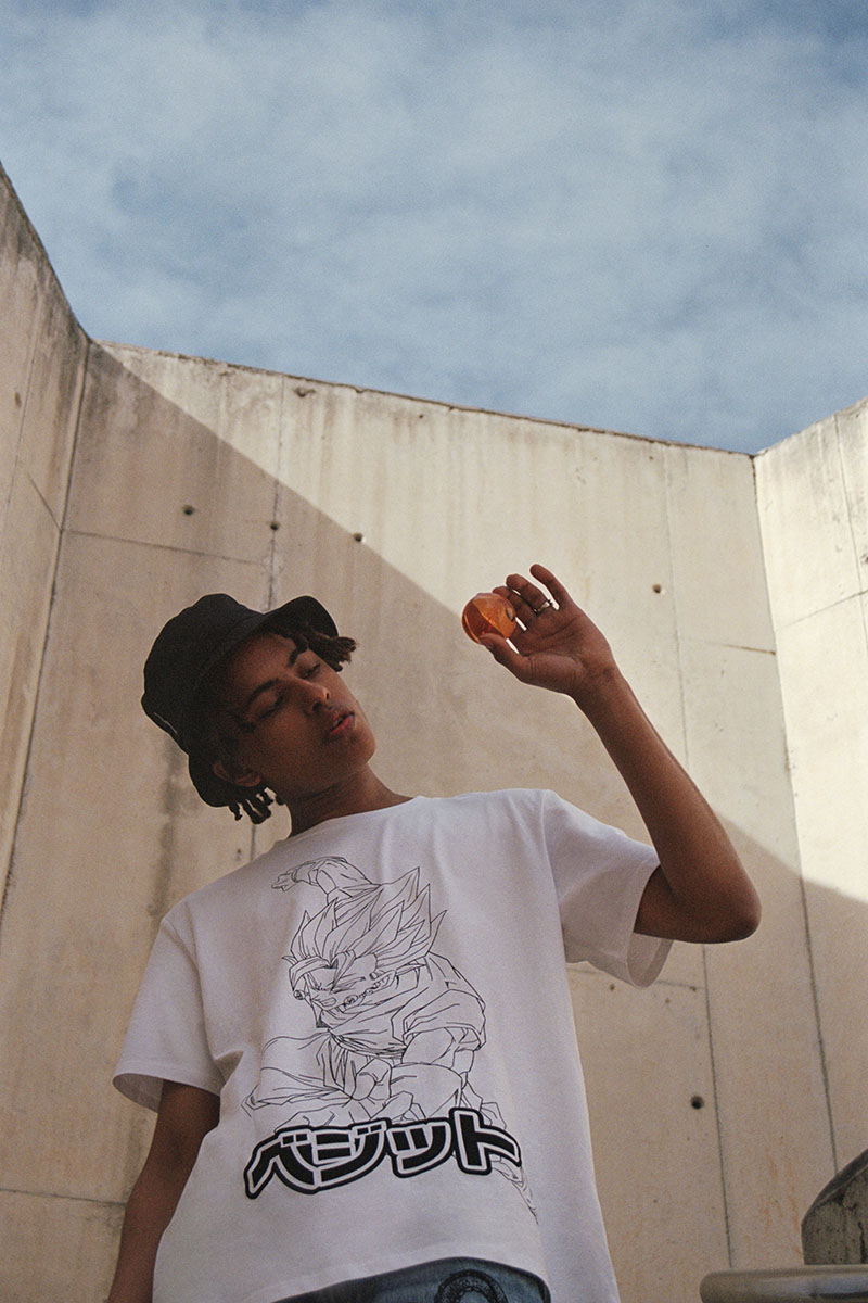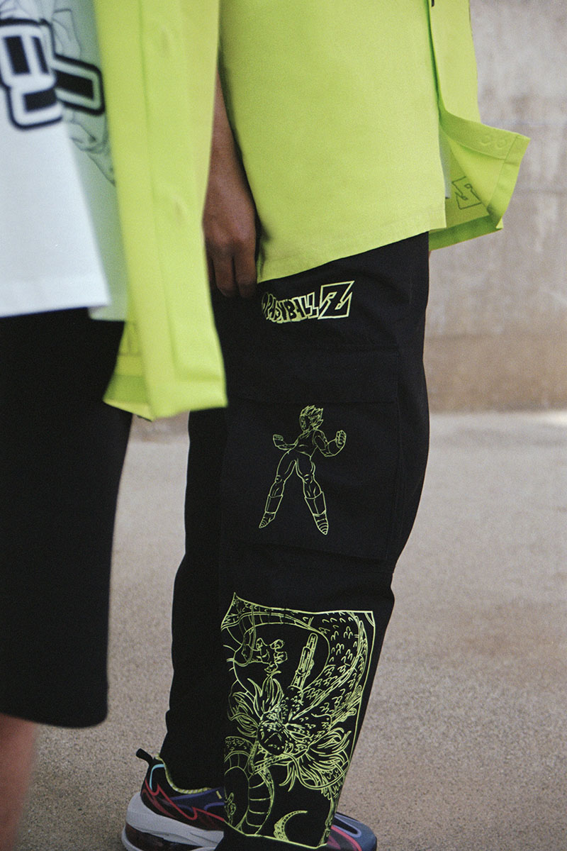 El hecho de que esta saga se desarrollara en los 90′ también ha influenciado en las siluetas de las prendas que conforman la colección. Pantalones de corte balloon en denim y loneta, una camisa ligera y camisetas con estampado tie-dye llenas de colores flúor. Los vibrantes colores que se han escogido para la colección nos recuerdan inevitablemente a los trajes de los guerreros y androides protagonistas del anime.