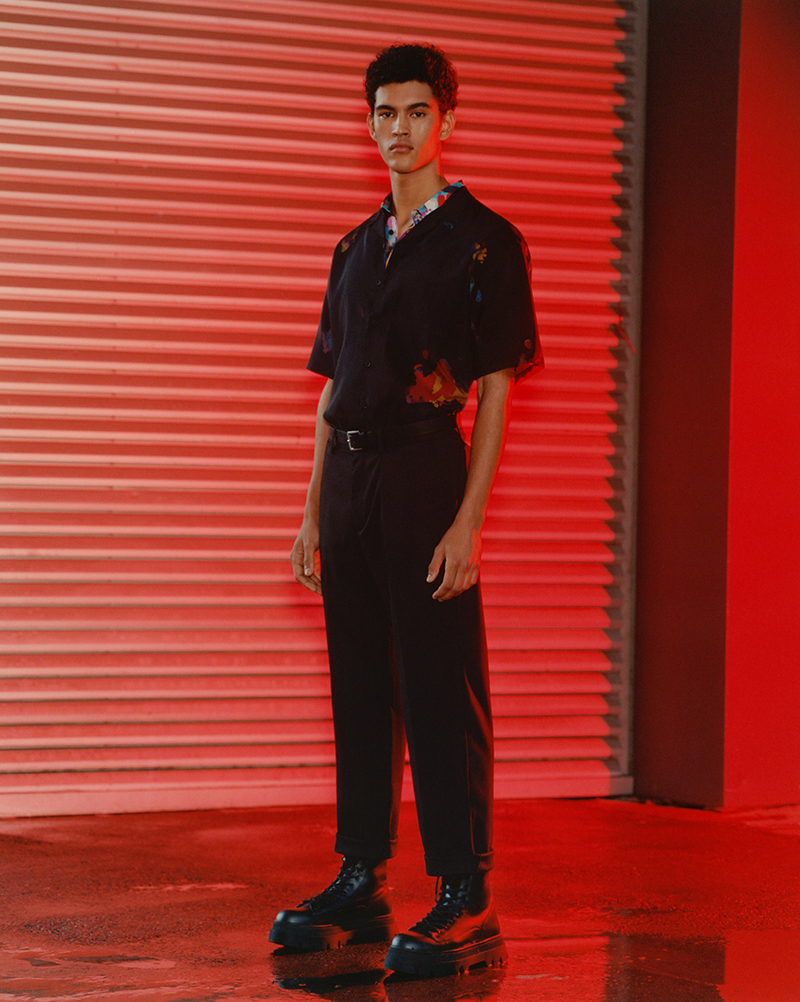 Siluetas propias del streetwear como sudaderas anchas y pantalones cargo, entran en sintonía con pantalones tailoring y cómodos jerséis de punto oversize que, por su cuello alto y sus colores naranjas y morados, pasan de la mera comodidad a la modernidad. Siguiendo la estética ecléctica y rompedora, nos proponen camisas con transparencias y de satén, decoradas con estampados digitales.