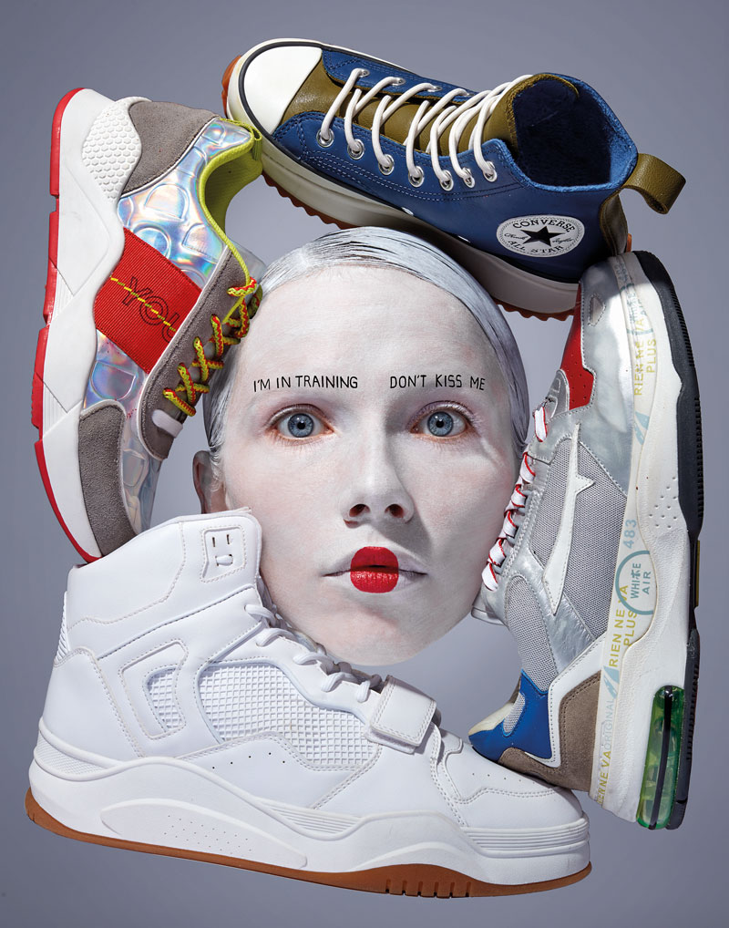 Arriba (Izda. a dcha., de arriba a abajo): Sneakers iridiscentes Desigual + Plataformas Run Star Hike Converse + Zapatillas Sharky multicolor Premiata + Zapatillas blancas Bershka