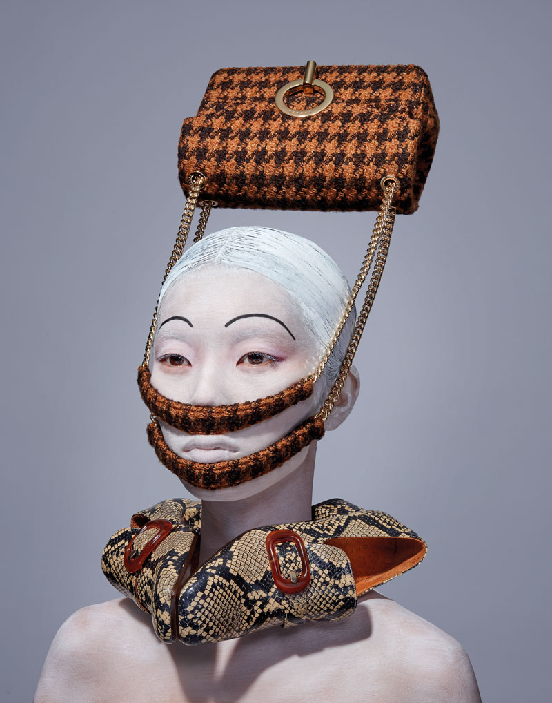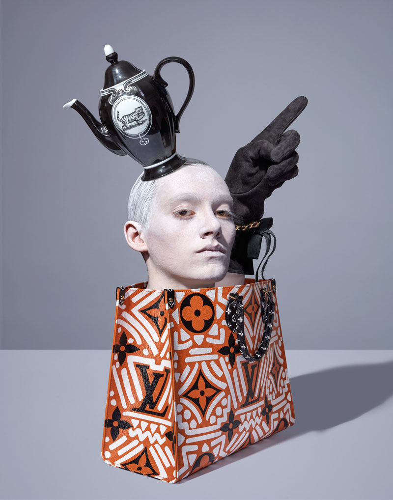 Arriba: Cafetera de porcelana negra con estampado felino Gucci x Richard Ginori + Guantes con perlas y cadena Chanel + Shopping bag crafty Louis Vuitton