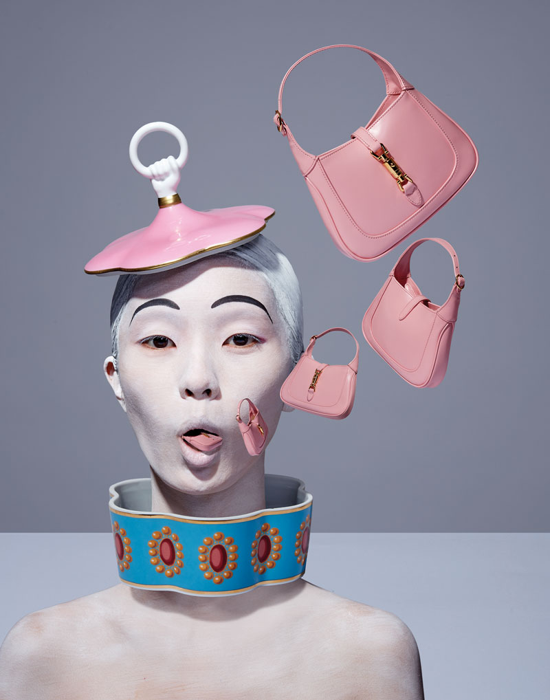 Arriba: Bolso Jackie Gucci + Caja de porcelana con estampado broche más tapa con puño Gucci x Richard Ginori