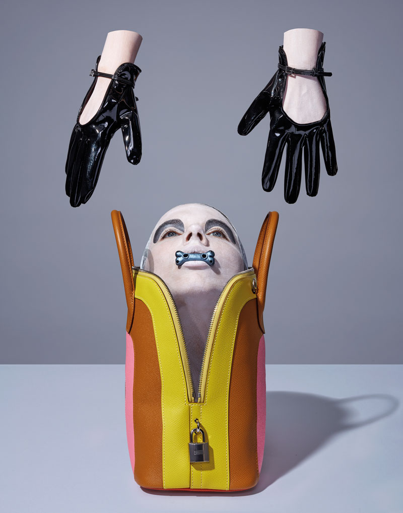 Arriba: Guantes charol Gucci + Bolso Bolide Rainbow Hermès + Hueso jewelry para cordones de calzado Eva Burton