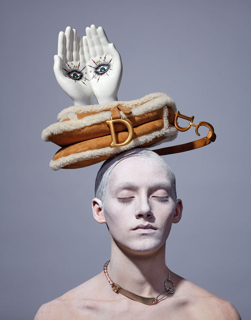 Arriba: Vaciabolsillos de porcelana con forma de manos y ojos estampados Gucci x Richard Ginori + Bolso Saddle borreguillo Dior + Collar rolex y perlas Biis