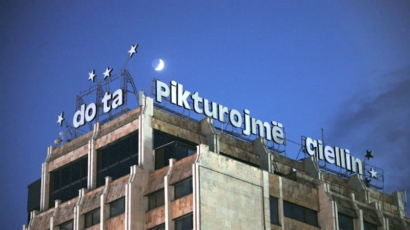 El que fuera un cinco estrellas, esta coronado por una instalación estrellada y luminosa de Petrit Halilaj. Halilaj, originario de Kosovo, ha transformado la antigua señalización de la fachada del hotel reordenando las letras que ahora dicen en albanés: “Cuando el sol se va, pintamos el cielo”. Halilaj, en 2013 fue el primer artista en representar a Kosovo en la Bienal de Venecia.