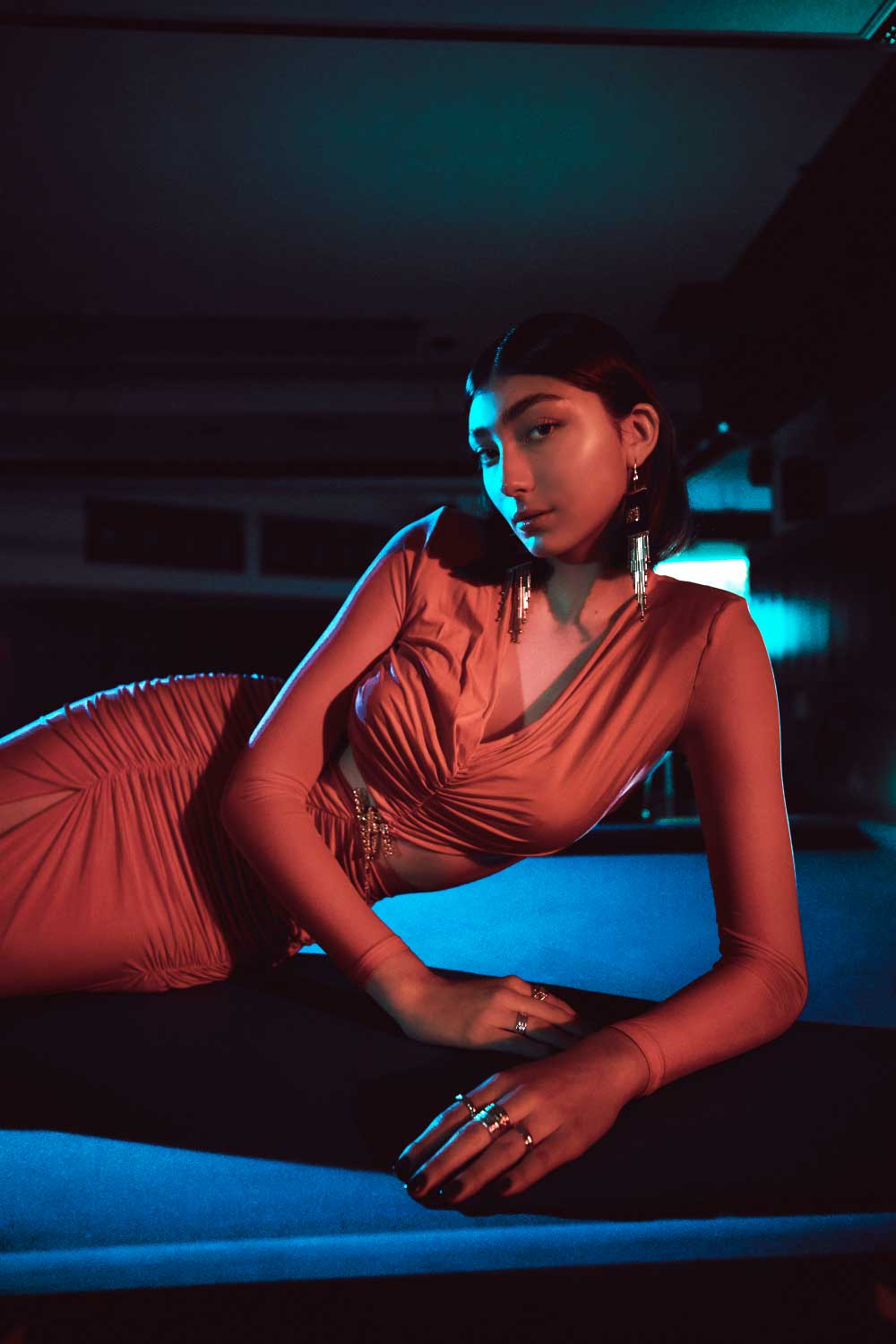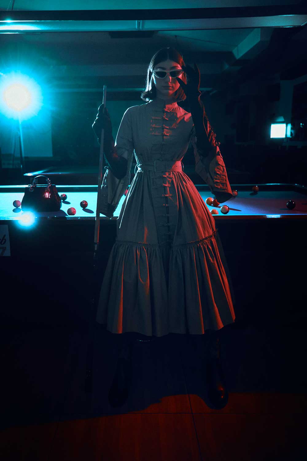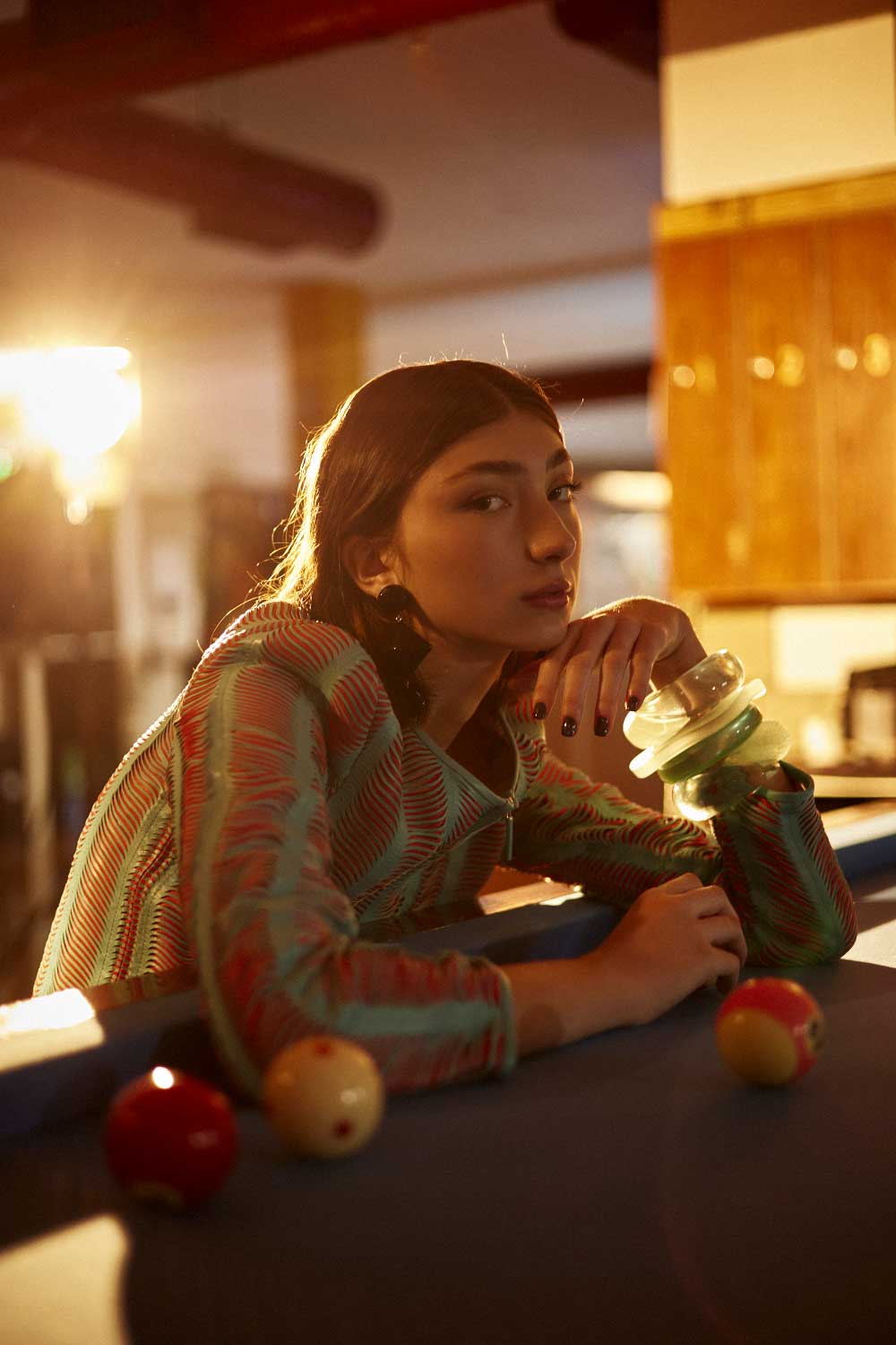 La historia detrás del editorial parte de la localización; queríamos hacer un tema dentro de un billar, mostrando a una mujer con looks glamurosos, segura de sí misma, y jugando con las luces y los geles de color para un aire misterioso.