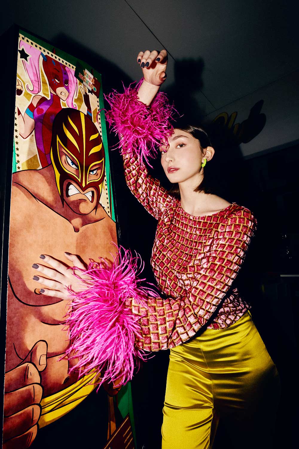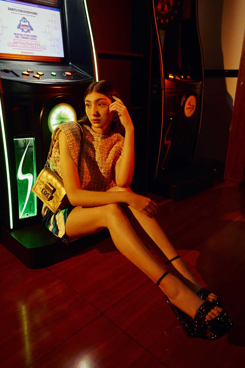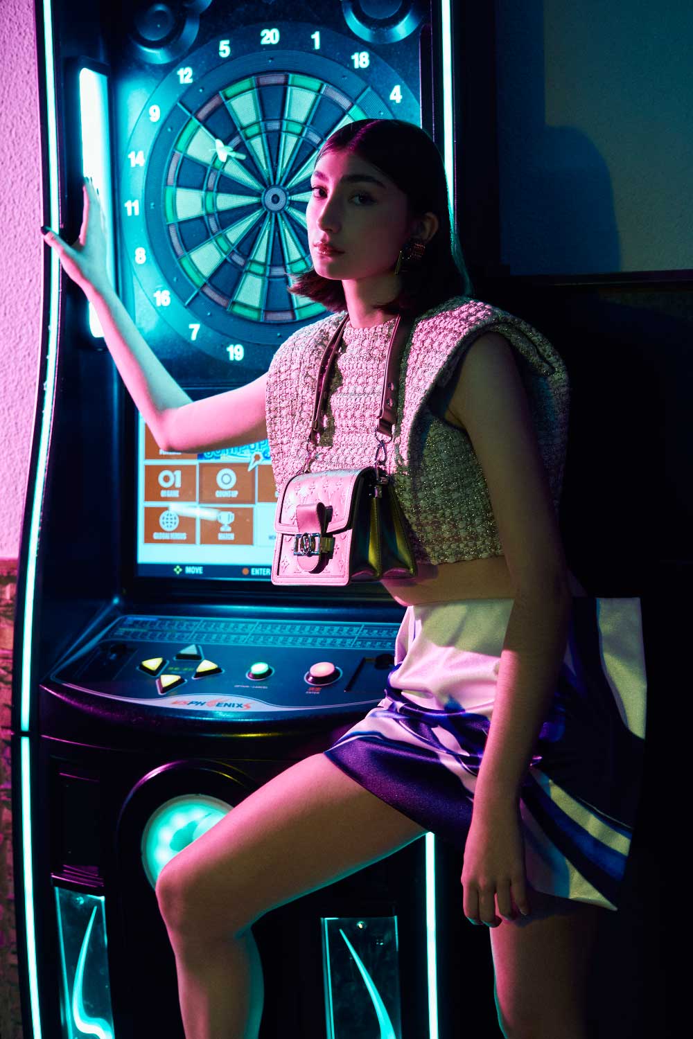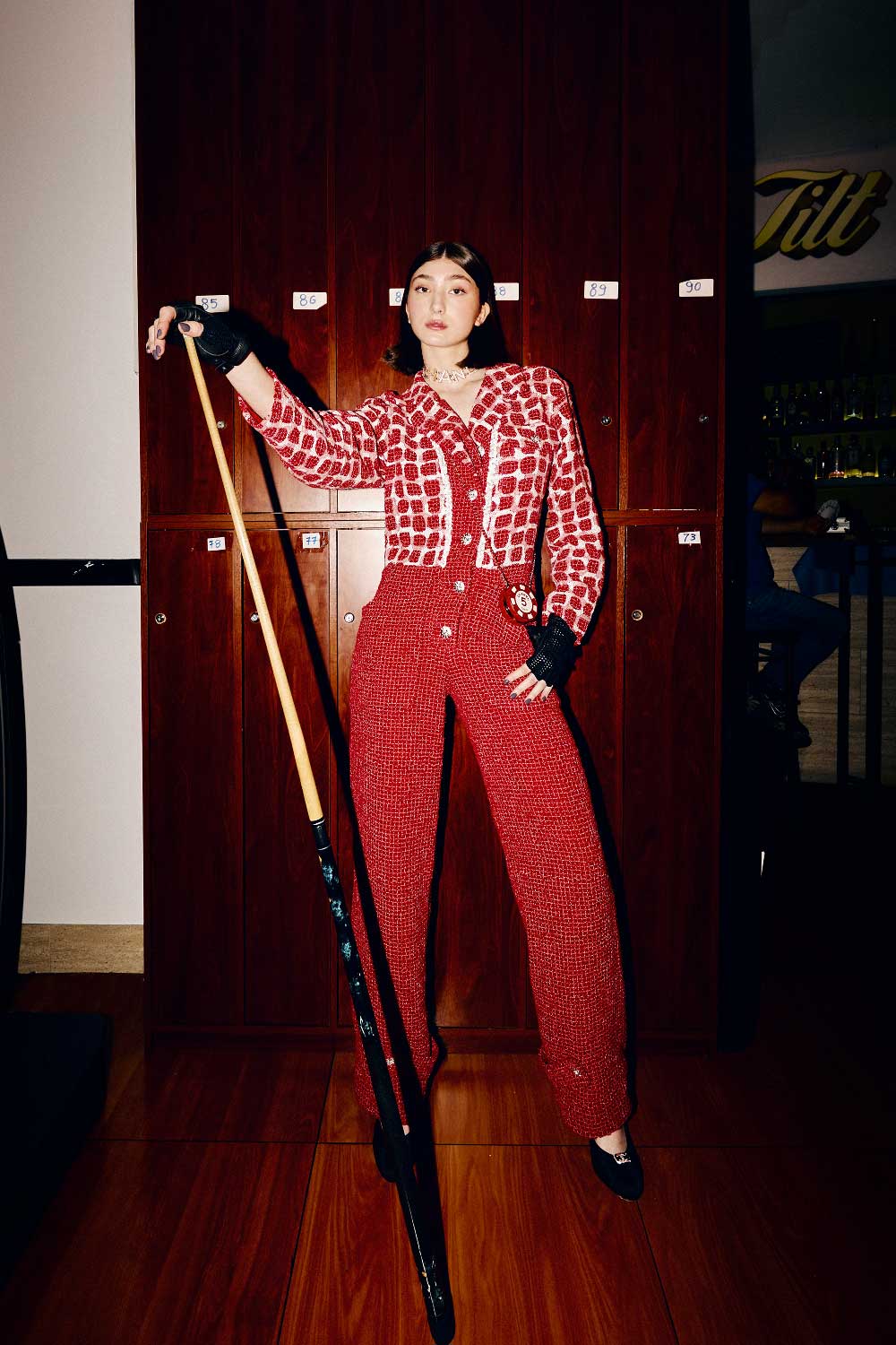 La elección de los looks la hice a partir de la localización, para que encajasen sobre todo en cuanto a colores (fucsia, rojo, pistacho, turquesa, beige y negro) y tuviese coherencia con la historia. En el caso particular de Chanel, elegí ese look con el bolso en forma de ficha de juego porque me parecía perfecto para el sitio. Del look de Armani me encantó el tejido de la chaqueta y las maxi pulseras. Añadimos el toque sofisticado con las plumas de Parosh y el vestido de Elisabetta Franchi, y del de Dior resaltan los guantes largos con brocado. Vi claro que quería una foto con esos guantes y el palo de billar. Y el de Louis Vuitton nos encajaba con las maquinas de juego.