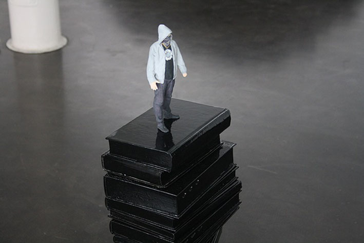 La pieza central es una construcción compuesta por libros pintados de negro, en una suerte de homenaje a la capacidad de resistencia desde la cultura, desde el pensamiento y la racionalidad. «Se trata de una estructura cerrada, protegida, una suerte de ágora donde posibilitar el trabajo en común con una serie de agentes involucrados en la creacion. Representa la resistencia, con ciertas evocaciones cinematográficas de referencia, a La Chinoise, 1967, de Jean Luc Godard, o a la novela Fahrenheit 451, de Ray Bradbury. Y no deja de contarnos que la trinchera, sin duda, ha de ser intelectual».