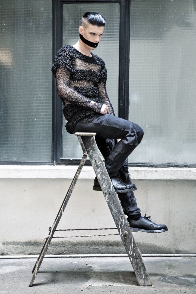 Aaron: Gargantilla en boca PIERS ATKINSON + Top ASGER JUEL LARSEN + Pantalón LINA OSTERMAN + Zapatos KOMAKINO para Dr Martens