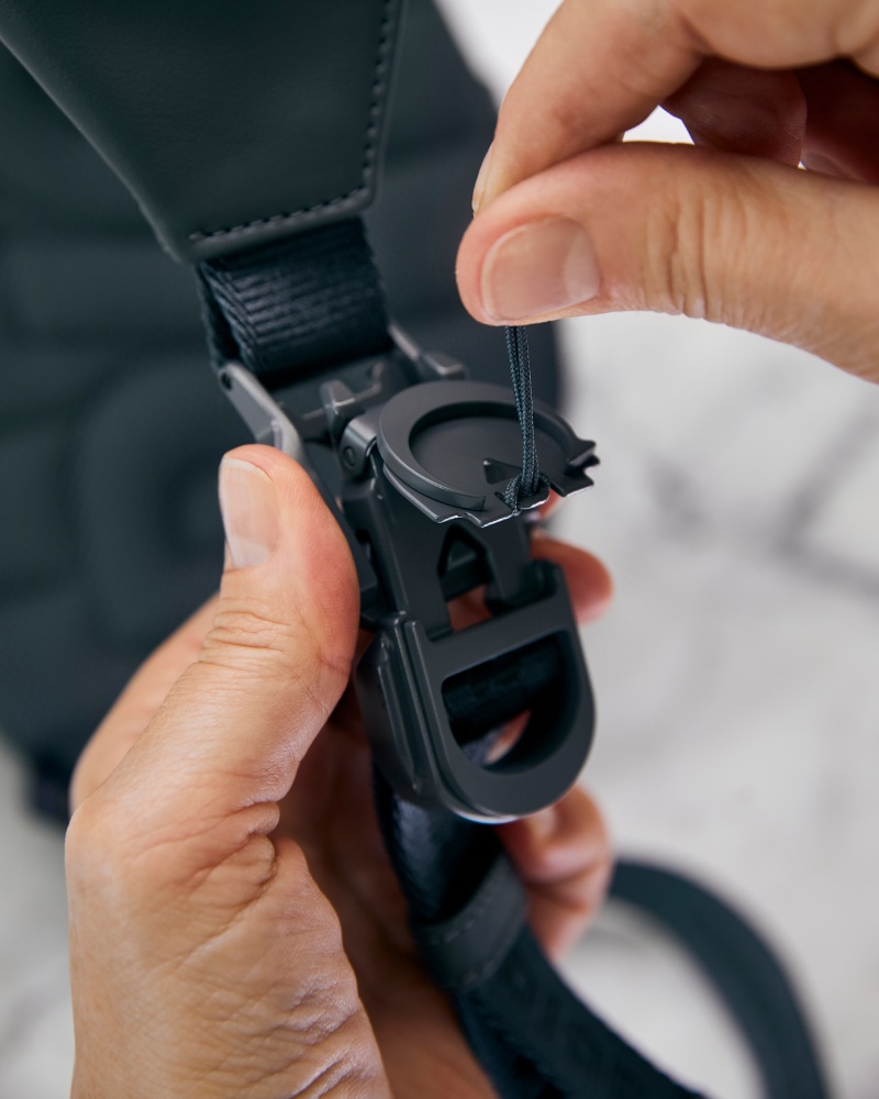 La bandolera, otra parte esencial del nuevo bolso de Dior para hombre, presenta otro bolsillo oculto para un extra de almacenamiento. Se incorpora un nuevo tipo de hebilla, sublimada con las iniciales de su fundador. Esta nueva hebilla CDLock se abre y se cierra con mucha facilidad gracias a su mecanismo magnético; pero solo se abrirá si tiramos de la pequeña correa.