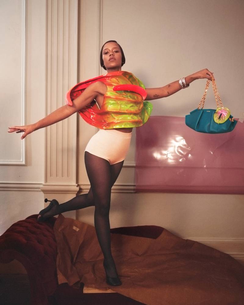 Taylor Russell, embajadora mundial de LOEWE e imagen de la nueva colección SS23 de la casa, con bolso Paseo combinado con cadena dorada