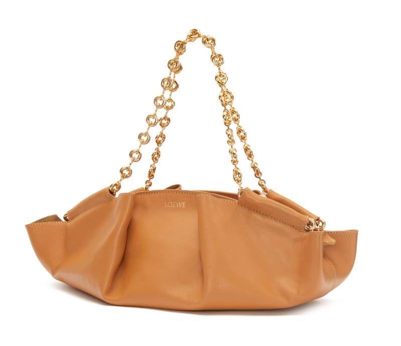 Resaltando siempre la silueta única que caracteriza a Paseo, se ofrece el tamaño pequeño combinado con una cadena dorada en forma de donut que serpentea por el borde del bolso, haciéndolo así un absoluto básico de tus looks de noche. Y como broche final, el logo de LOEWE, grabado en oro en la parte delantera de todos los modelos del bolso Paseo.