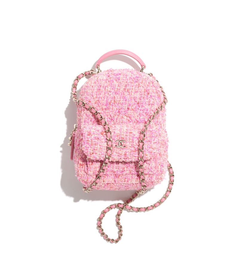 Las mochilas, por otra parte, se presentan como un pequeño accesorio delicado. Se ha jugado con las proporciones del complemento y se presenta en formato mini. Una construcción en tweed rosa y blanco aporta un aire despreocupado y naif ideal para las generaciones más jóvenes. Las míticas cadenas entrelazadas en piel sirven para elevar este nuevo complemento de Chanel.