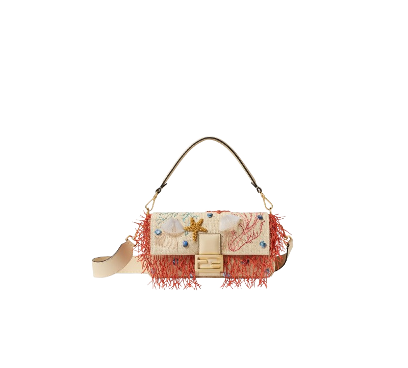 Fendi ha reinventado sus modelos clásicos, como la Baguette, incorporando detalles que van desde tonos coral hasta conchas marinas y estrellas de mar.