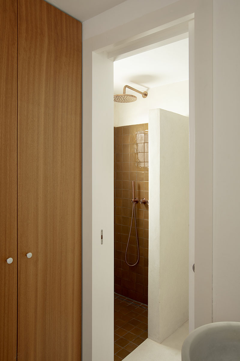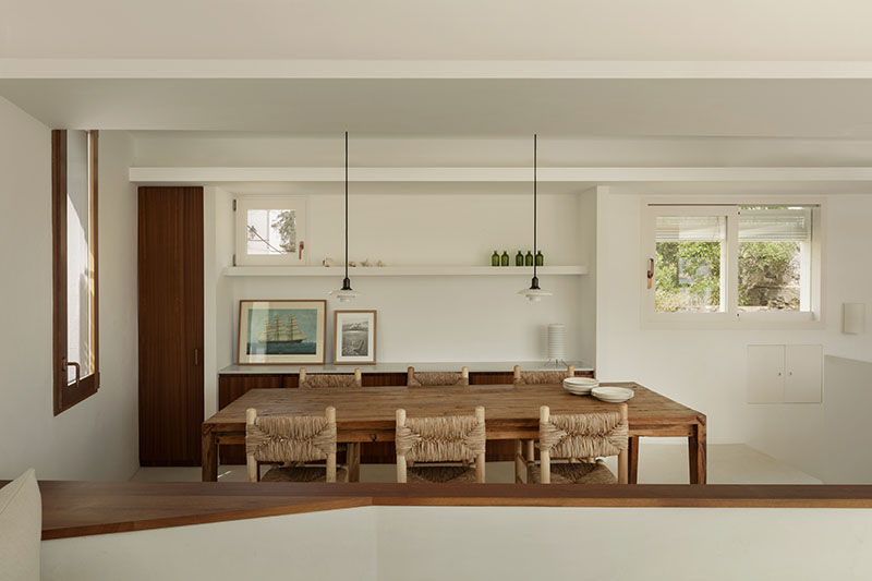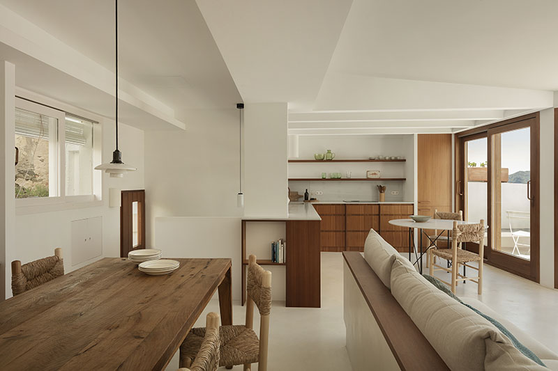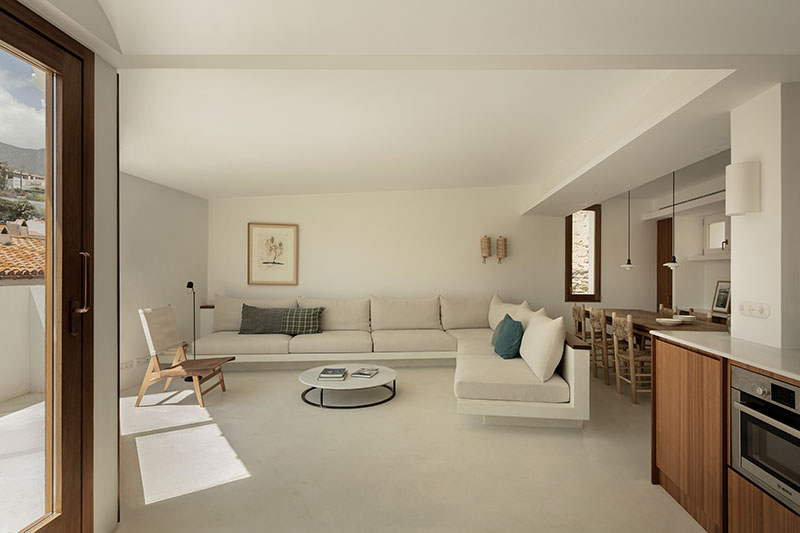 Guiado por este propósito, Bombi+Gómez recurre a una paleta matérica sustentada en el empleo de pizarra, madera de iroko y micromortero cuyos valores táctiles y cromáticos reconcilian la relación con el paraje y convocan de forma elíptica la memoria constructiva del territorio. En la planta baja, el pavimento tradicional de trencadís en pizarra fortalece la continuidad visual con las calles del pueblo. El elemento principal resulta ser un sofá diseñado expresamente para la estancia y construido sobre una base de obra tapizada en lino rosa empolvado. Lo circundan piezas auxiliares que integran, con discreción, almacenaje y electrodomésticos. Completan la estancia las luminarias de Santa & Cole y Flos, así como una cuidada selección pictórica, además de un dormitorio en suite para los hijos.