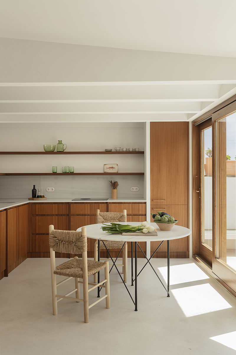 En el último piso, destinado a la vida diaria, la vivienda se abre plenamente hacia una terraza con vistas al Mediterráneo. Este espacio diáfano reúne cocina, comedor y salón, organizados para maximizar la entrada de luz natural. El espacio culinario presenta muebles bajos y estanterías abiertas en iroko y la zona del comedor apuesta por un mobiliario tradicional y luminarias contemporáneas de Louis Poulsen. En el salón destaca otro sofá de obra diseñado por Bombi+Gómez, acompañado por la butaca Barceloneta, creación de Milá y Correa para Santa & Cole.