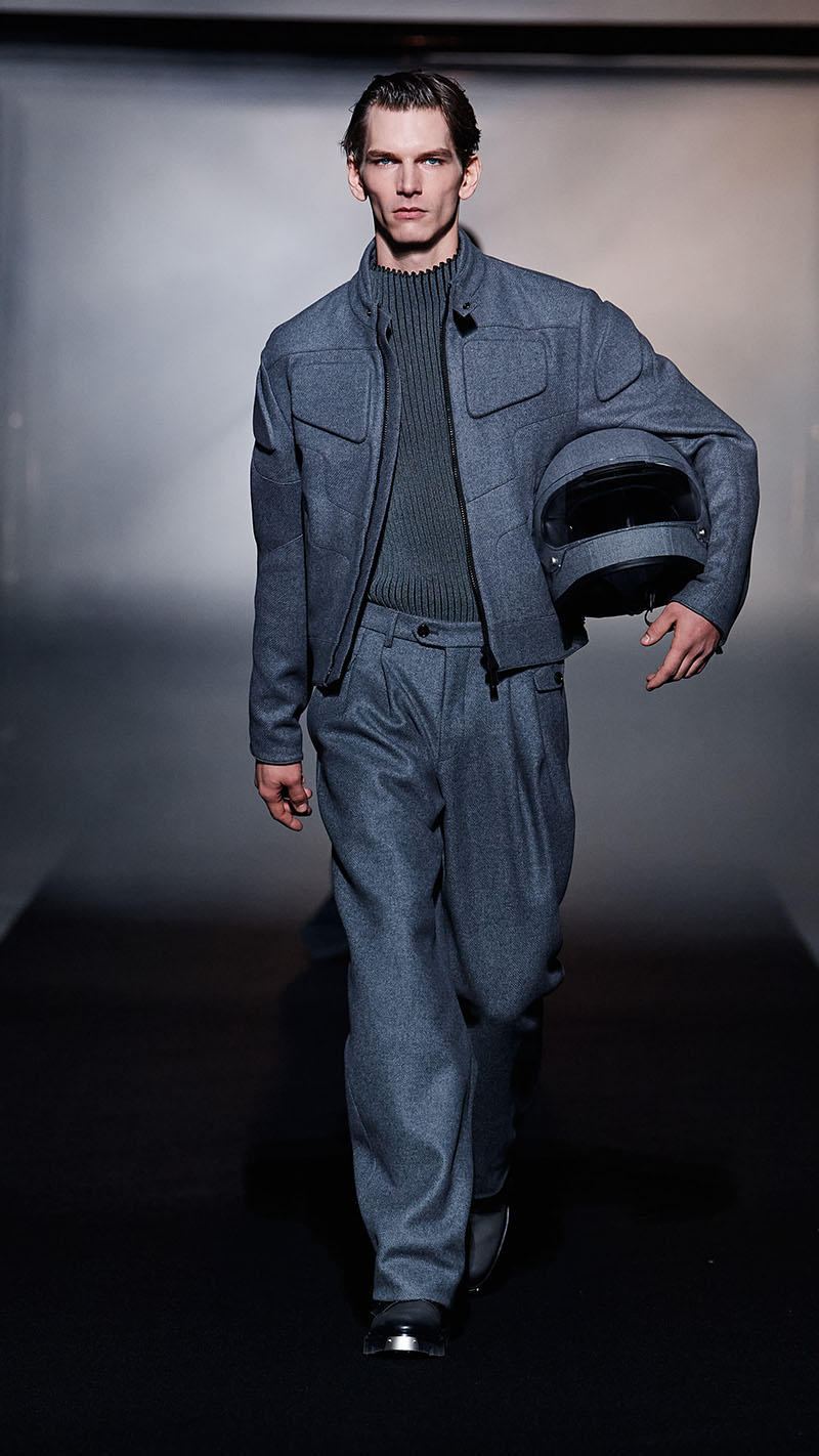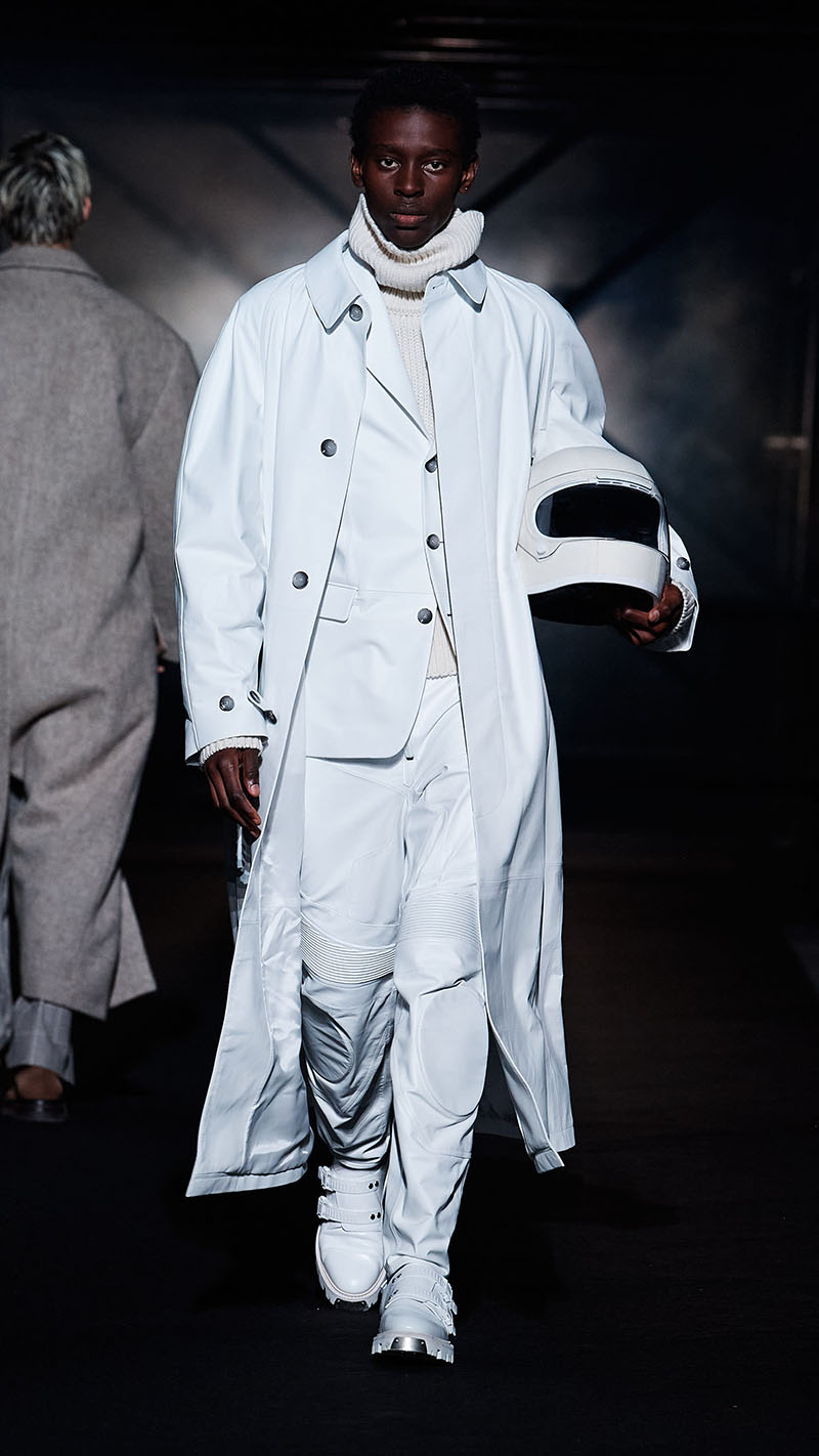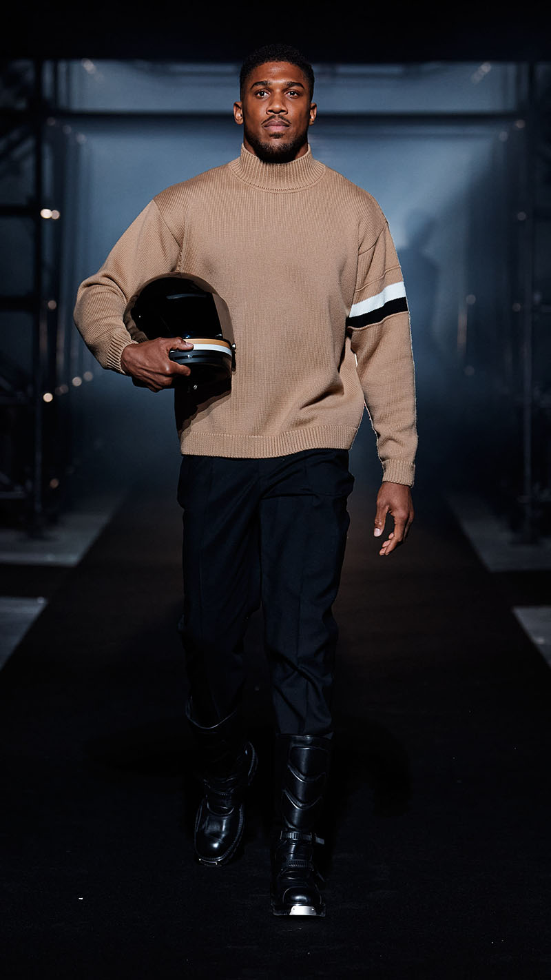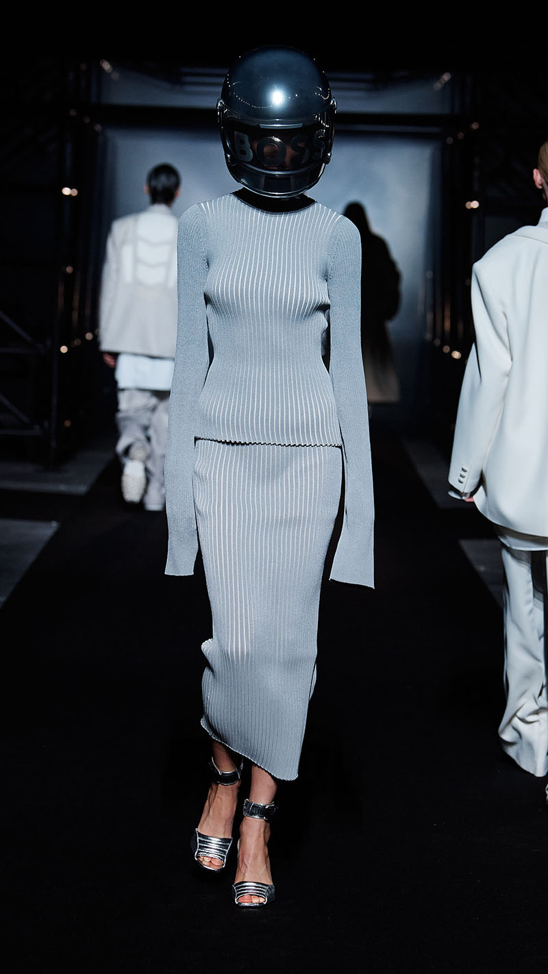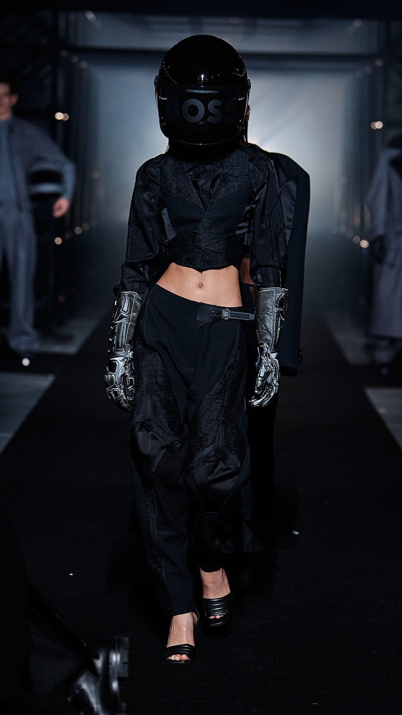 Para desarrollar los diseños, han partido de algunas de las piezas más emblemáticas del archivo de BOSS para reinventarlas a través de elementos tan contrarios al tailoring clásico como el mundo del motociclismo. Al comenzar el desfile, un grupo de motoristas vestidos con looks personalizados de BOSS dibujaron los limites de la pasarela antes de entrar en las esferas metálicas para hacer acrobacias.
