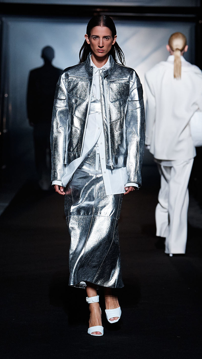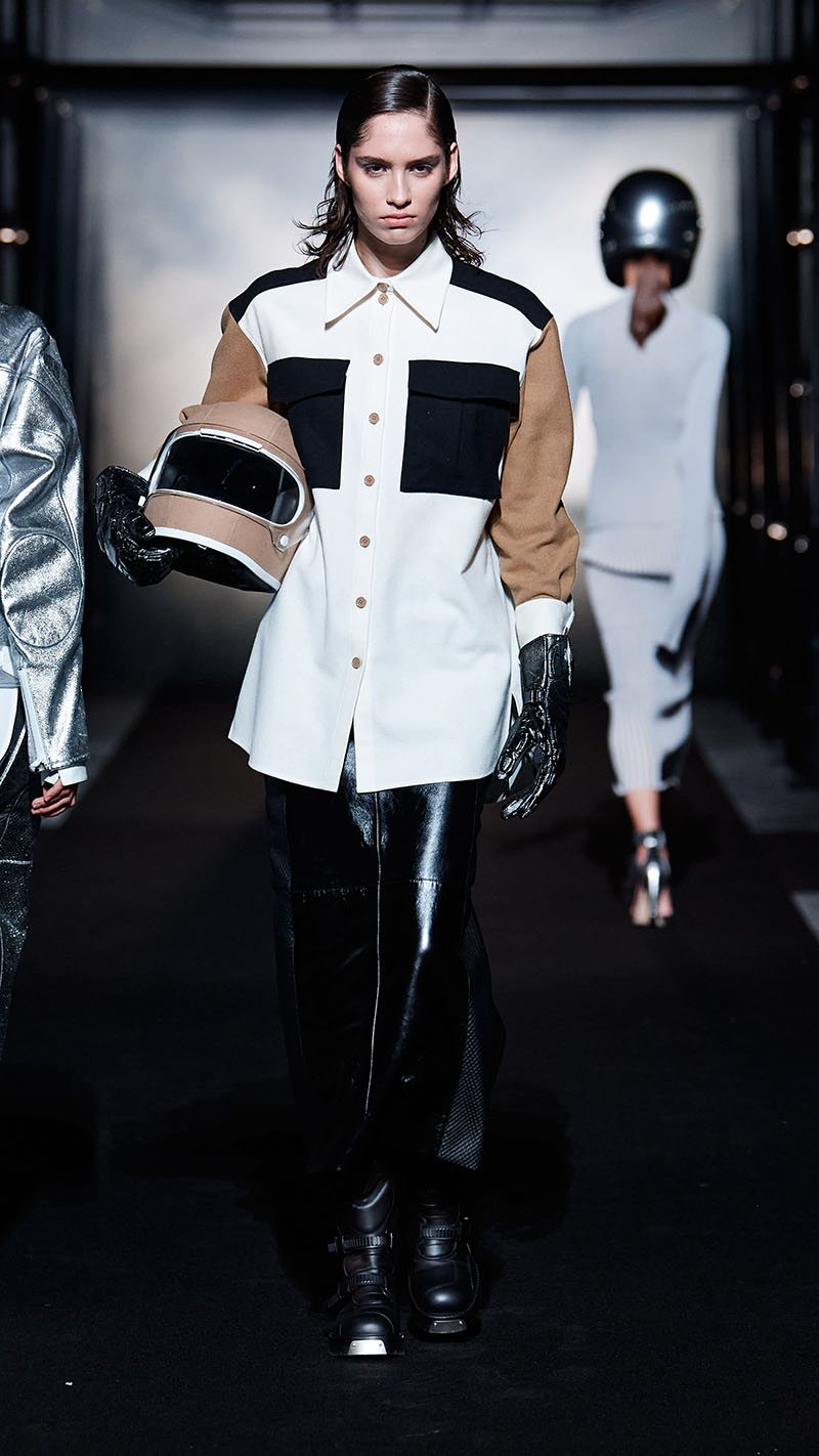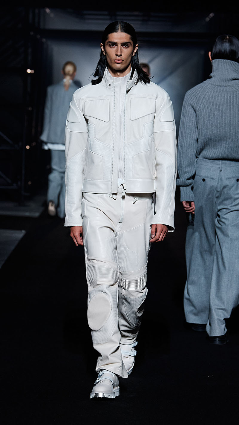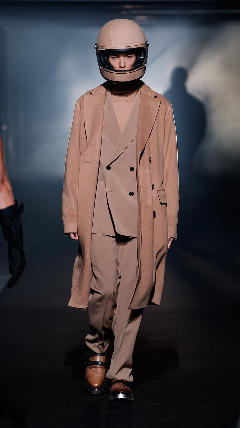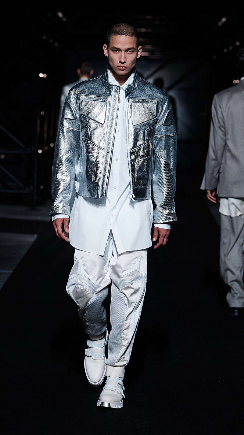 Para desarrollar los diseños, han partido de algunas de las piezas más emblemáticas del archivo de BOSS para reinventarlas a través de elementos tan contrarios al tailoring clásico como el mundo del motociclismo. Al comenzar el desfile, un grupo de motoristas vestidos con looks personalizados de BOSS dibujaron los limites de la pasarela antes de entrar en las esferas metálicas para hacer acrobacias.